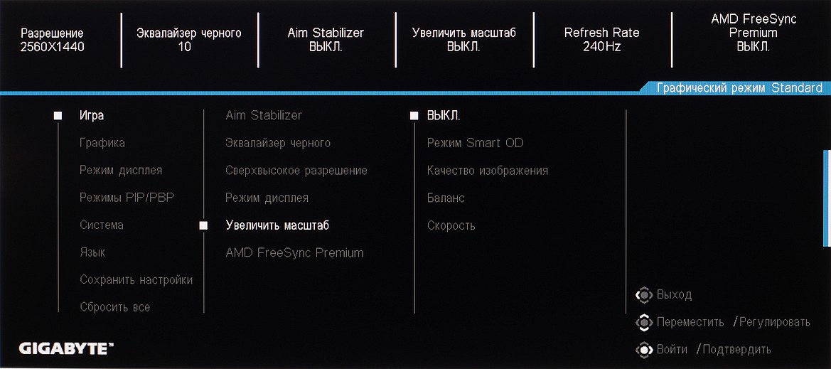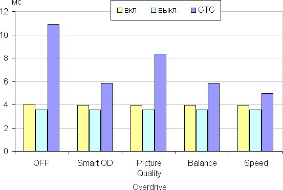 Время отклика зависит от значения настройки Overdrive (ошибочно переведенной как Увеличить масштаб), которая управляет разгоном матрицы. Ступеней регулировки пять. График ниже показывает, как меняется время включения и выключения при переходе черный-белый-черный (столбики «вкл.» и «выкл.»), а также среднее суммарное время для переходов между полутонами (столбики GTG) в случае режима с частотой обновления 240 Гц:
