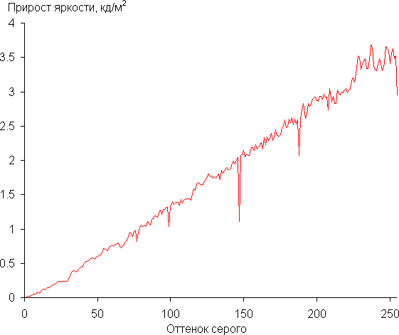 Реальная гамма-кривая ближе всего к стандартной (с учетом близости R2 к единице) при выборе варианта Гамма 2.2, поэтому далее мы измерили яркость 256 оттенков серого (от 0, 0, 0 до 255, 255, 255) при этом значении. График ниже показывает прирост (не абсолютное значение!) яркости между соседними полутонами:
