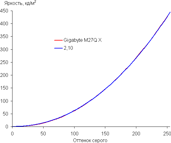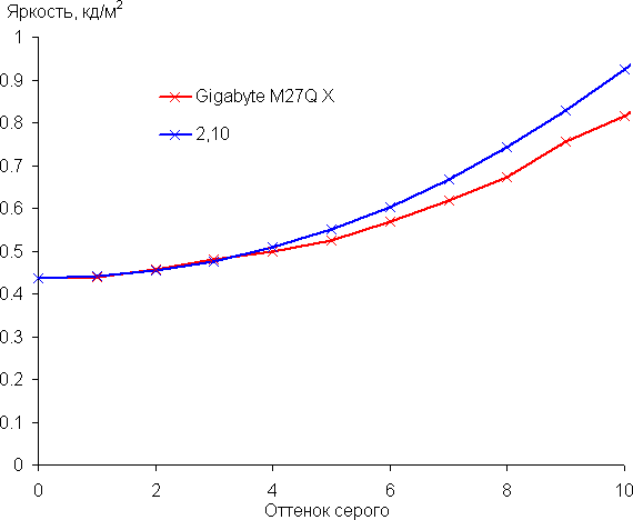 Рост прироста яркости весьма равномерный. При этом каждый следующий оттенок значимо ярче предыдущего, за исключение первого ближайшего к черному оттенка серого, который по яркости от черного не отличается: