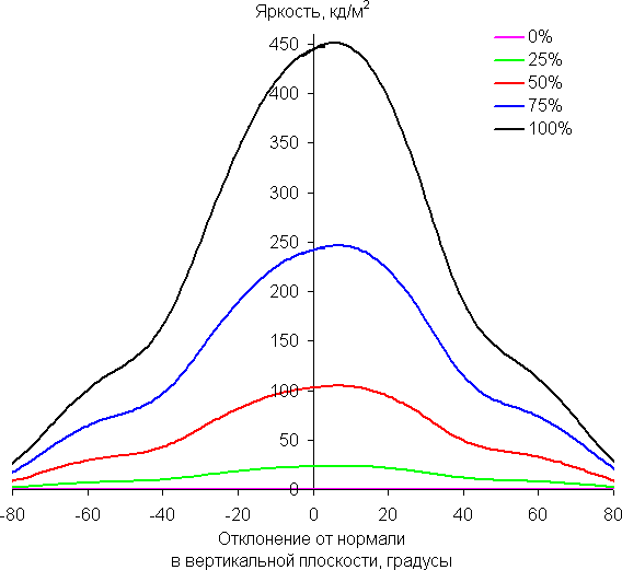 Углы обзора по снижению яркости довольно широкие. При отклонении в диагональном направлении яркость черного поля начинает резко возрастать уже при 20°-30° отклонения от перпендикуляра к экрану. Если сидеть не очень далеко от экрана, то черное поле по углам будет заметно светлее, чем в центре. Контрастность в диапазоне углов ±82° в случае отклонения по диагонали приближается к отметке 10:1, но все же не опускается ниже.