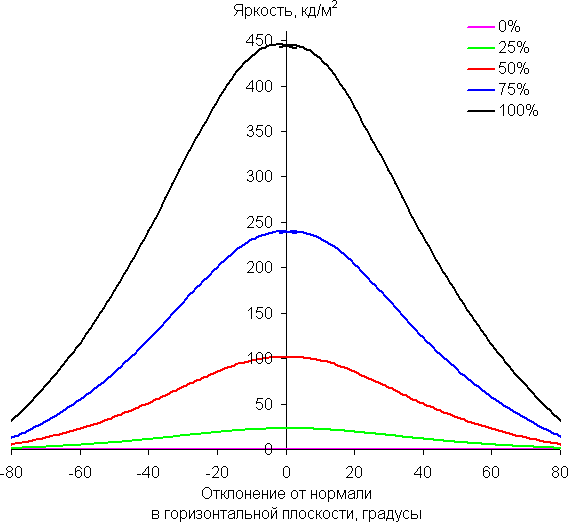 В качестве реперной точки можно выбрать отклонение в 45°, что может быть актуальным в случае, например, если изображение на экране рассматривают два человека одновременно. Критерием сохранения правильности цветов можно считать значение ΔE меньше 3. Стабильность цветов очень хорошая, это является одним из главных достоинств матрицы типа IPS.