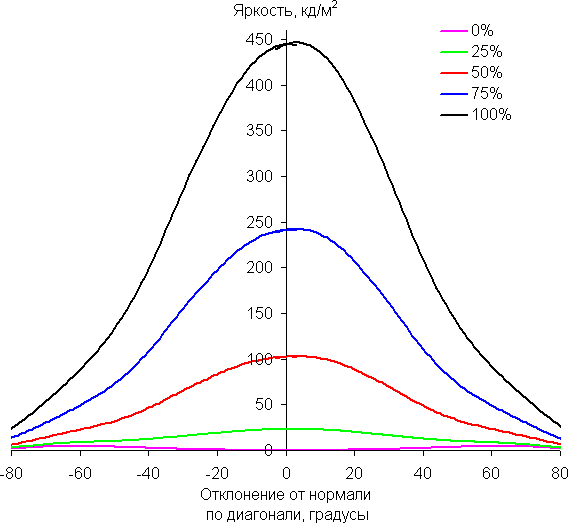 Чтобы выяснить, как меняется яркость экрана при отклонении от перпендикуляра к экрану, мы провели серию измерений яркости черного, белого и оттенков серого в центре экрана в широком диапазоне углов, отклоняя ось датчика в вертикальном, горизонтальном и диагональном (из угла в угол для формата 16:9) направлениях.