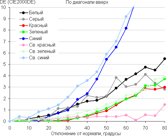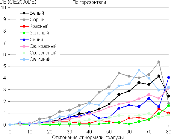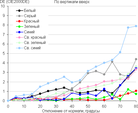 Для количественной характеристики изменения цветопередачи мы провели колориметрические измерения для белого, серого (127, 127, 127), красного, зеленого и синего, а также светло-красного, светло-зеленого и светло-синего полей во весь экран с использованием установки, подобной той, что применялась в предыдущем тесте. Измерения проводились в диапазоне углов от 0° (датчик направлен перпендикулярно к экрану) до 80° с шагом в 5°. Полученные значения интенсивностей были пересчитаны в ΔE относительно замера каждого поля при перпендикулярном положении датчика относительно экрана. Результаты представлены ниже: