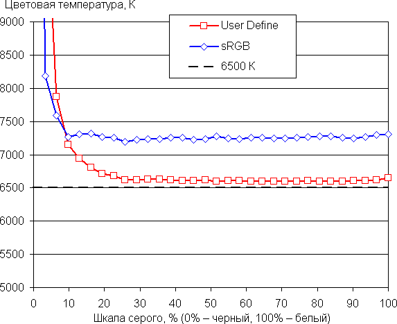 Цветовой баланс просто при выборе профиля User Define (Определяется пользователем) для настройки Color Temp. (Цветовая температура), который обеспечивает максимальную яркость и контрастность с сохранением приемлемого качества изображения, отличный и отвечает критериям профессиональных мониторов, так как цветовая температура близка к стандартным 6500 К, и отклонение от спектра абсолютно черного тела (параметр ΔE) ниже 3. После выбора профиля sRGB баланс чуть хуже, но все равно остается достаточно хорошим для любых работ, не требующих особо точной цветопередачи. Графики ниже показывают цветовую температуру на различных участках шкалы серого и ΔE для профилей User Define без коррекции и sRGB.