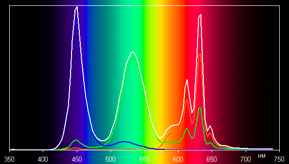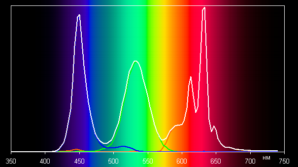 Можно предположить, что в светодиодах подсветки применяется синий излучатель и зеленый и красный люминофоры, при этом в красном люминофоре (а может и в зеленом) используются так называемые квантовые точки. Хорошее разделение компонент позволяет получить уширенный цветовой охват. В случае профиля sRGB с корректировкой цветового охвата компоненты подмешиваются друг к другу в значительной степени: