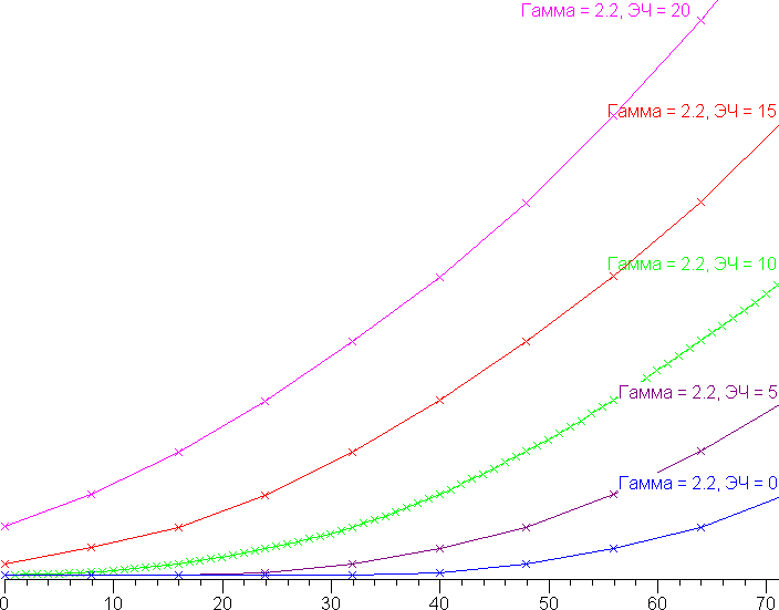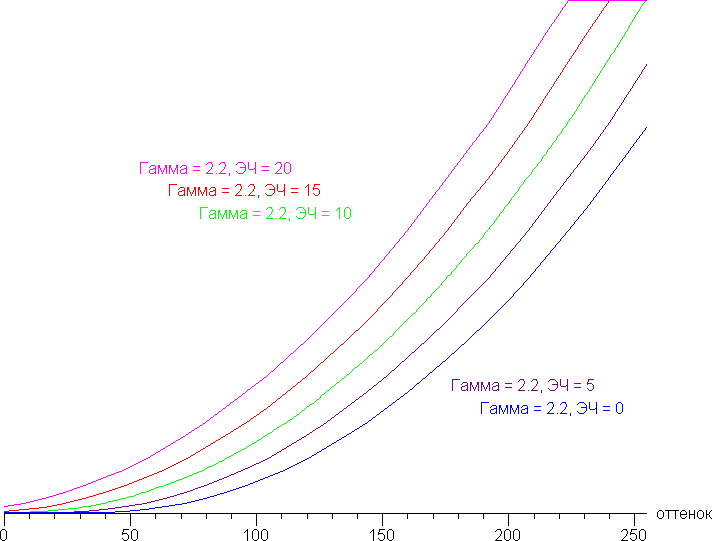 Дополнительной настройкой Black Equalizer (или Эквалайзер черного (ЭЧ) значения от 0 до 20, по умолчанию 10) можно скорректировать гамма-кривую, улучшая различимость деталей в тенях. Это может быть полезно в играх с темными сценами. Ниже приведены гамма-кривые при нескольких значениях Black Equalizer (построенные по 32 точкам):