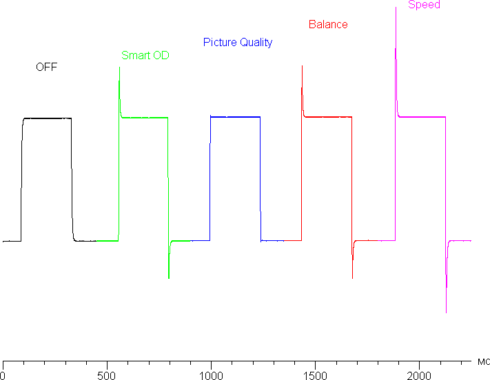 Ниже приведены графики полутонового перехода между оттенками 50% и 70% и обратно при различных значениях настройки Overdrive (по вертикали — яркость, по горизонтали — время, для наглядности графики выстроены последовательно):