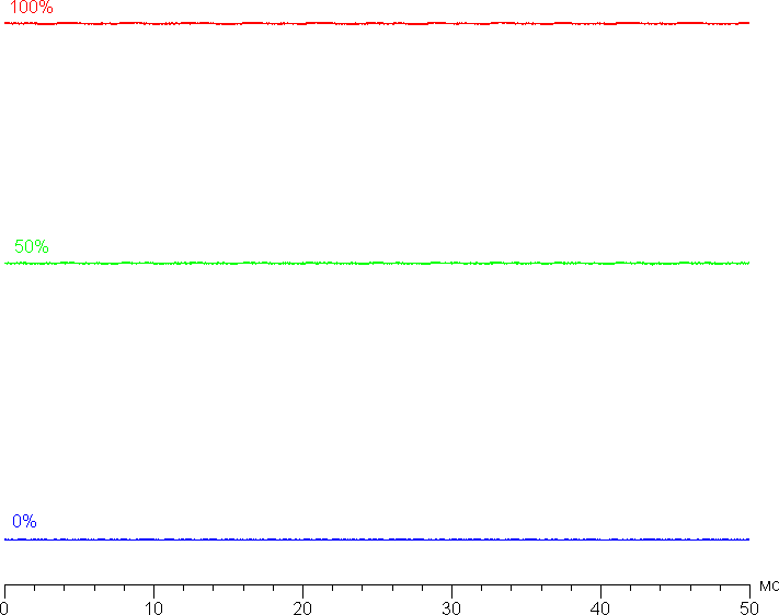 Яркость монитора меняется именно яркостью подсветки, то есть без ущерба для качества изображения (сохраняется контрастность и количество различимых градаций) яркость монитора можно менять в широких пределах, что позволяет с комфортом играть, работать и смотреть фильмы как в освещенном, так и в темном помещении. На любом уровне яркости значимая модуляция подсветки отсутствует, что исключает видимое мерцание экрана. Для тех, кто привык распознавать знакомое сокращение, уточним: ШИМ отсутствует. В доказательство приведем графики зависимости яркости (вертикальная ось) от времени (горизонтальная ось) при различных значениях настройки яркости: