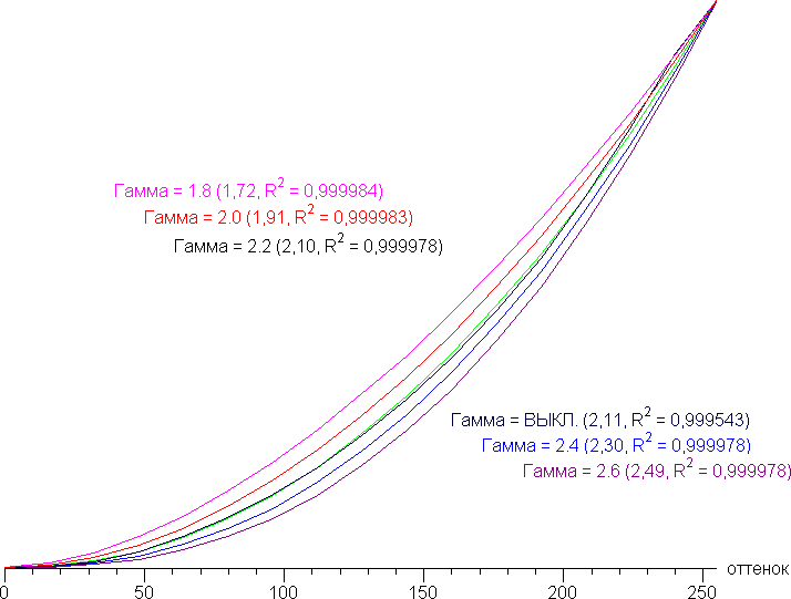 Реальная гамма-кривая зависит от выбранного значения списке Gamma (Гамма). Значения показателей аппроксимирующей функции приведены в скобках в подписях, там же — коэффициент детерминации R2: