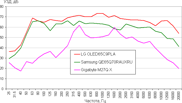 Встроенные громкоговорители звучат согласно их размерам и акустическому окружению — настолько громко, чтобы сидящий перед монитором пользователь уверенно расслышал системные сигналы, без низких частот вообще, с выраженным «пластиковым» призвуком из-за резонансов корпуса, стереофонический эффект присутствует. Сравним АЧХ этого монитора с АЧХ двух телевизоров высшего класса (воспроизводился розовый шум, уровни звукового давления в 1/3 октавах записывал шумомер Октава-111):