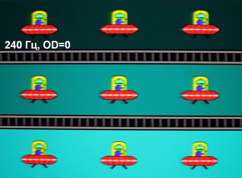 Попробуем представить, что было бы в случае матрицы с мгновенным переключением пикселей. Для нее при 60 Гц объект со скоростью движения 960 пиксель/с размывается на 16 пикселей, при 120 Гц — на 8, при 240 Гц — на 4 пикселя. Размывается, так как фокус зрения движется с указанной скоростью, а объект неподвижно выводится на 1/60, 1/120 или 1/240 секунды. Для иллюстрации этого сымитируем размытие на соответствующее количество пикселей: