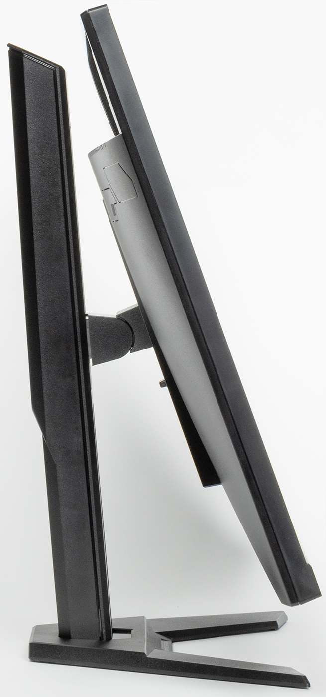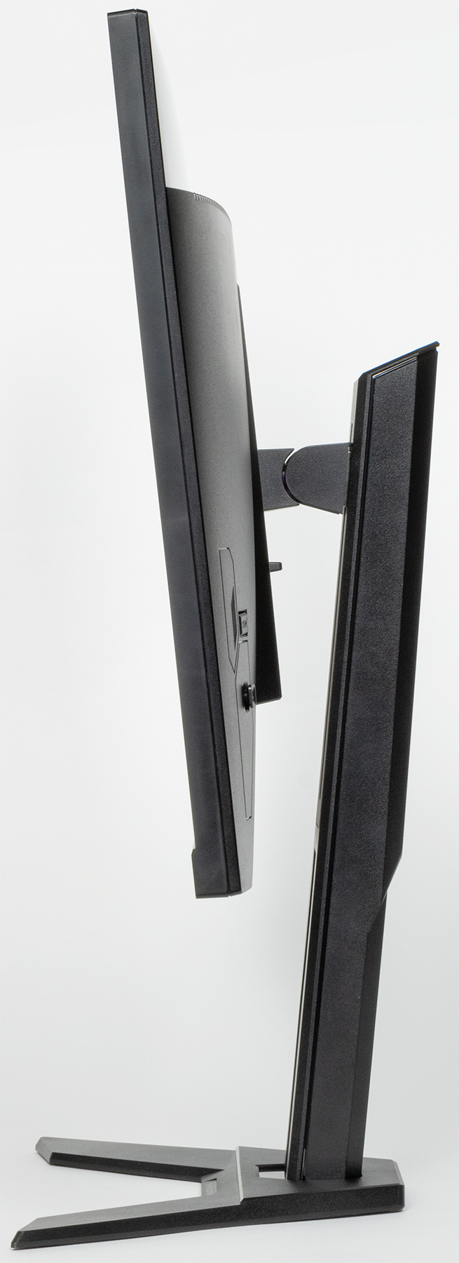 Стойка имеет фиксированную высоту, но подпираемый пружиной механизм со стальным рельсовым шариковым подшипником обеспечивает вертикальное перемещение шарнира, на который крепится блок экрана. В итоге легким движением руки экран можно установить на нужную высоту. Верхний шарнир позволяет немного наклонять блок экрана вперед от вертикального положения и больше наклонять назад.