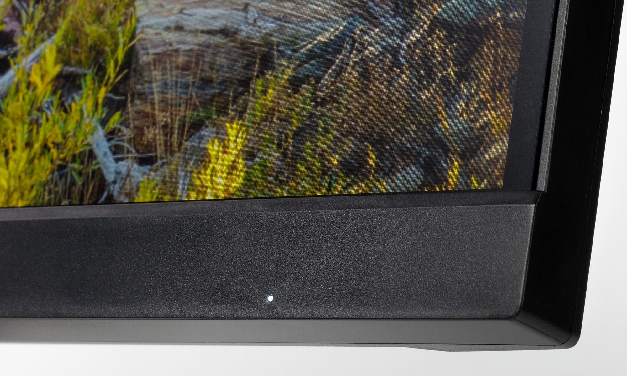 Внешняя поверхность матрицы черная, полуматовая, жесткая. Экран выглядит как монолитная поверхность, ограниченная снизу относительно узкой планкой, а сверху и по бокам — узкой окантовкой. Выведя изображение на экран, можно увидеть, что на самом деле между внешними границами экрана и собственно областью отображения есть неширокие поля — по 8 мм до внешних краев сверху и по бокам и примерно 1 мм до планки снизу.