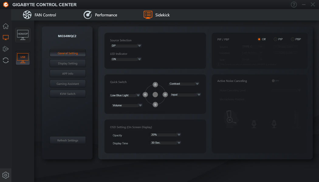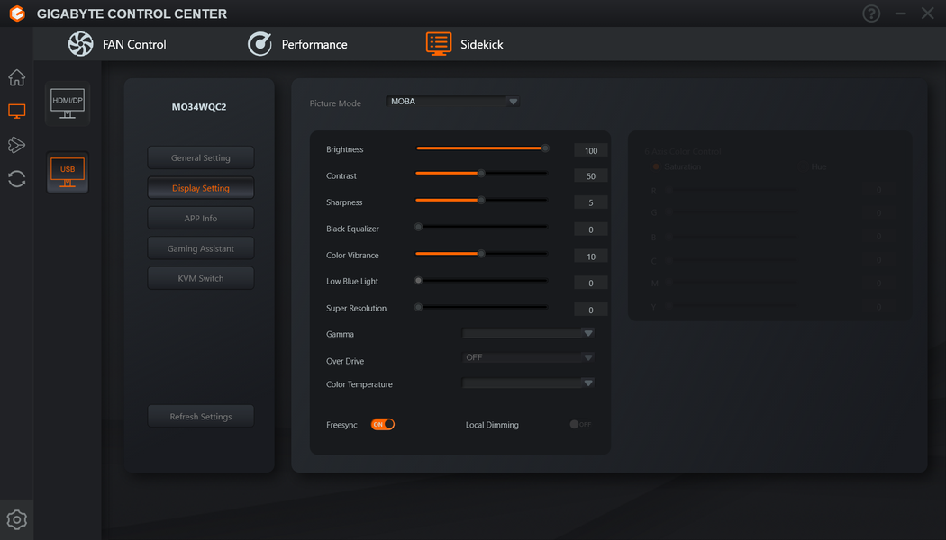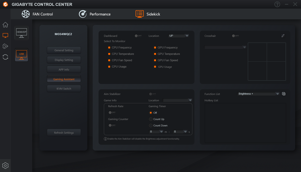 Монитором можно управлять с ПК с помощью фирменного ПО Gigabyte Control Center на вкладке Sidekick. Кроме настроек, доступных из меню монитора, в этом ПО можно задавать клавиатурные сокращения для ряда настроек и привязывать профиль с настройками монитора к активному приложению. Только при запущенной Gigabyte Control Center на монитор выводятся данные на панель Dashboard. И именно в Sidekick задаются клавиатурные сокращения, которым пользователь может увеличивать и уменьшать значение пользовательского счетчика. Что им полезно будет считать — зависит от игры.