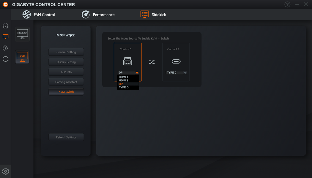 Есть встроенный концентратор USB (USB 3.2 Gen 1) на два порта. В наличие также функция KVM — к монитору по USB можно подключить клавиатуру и мышь (а можно и накопитель), чтобы затем их использовать с двумя источниками видеосигнала, например, с ПК и ноутбуком, или с ПК и планшетом. При этом один из источников должен быть подключен по USB-C (ввод видеосигнала по этому же интерфейсу, или по DisplayPort, или по HDMI), а второй — по USB через разъем USB-B (ввод видеосигнала или по DisplayPort, или по HDMI). Источники переключаются отклонением джойстика (если так настроено), выбором пункта в меню настроек монитора и в приложении Gigabyte Control Center.
