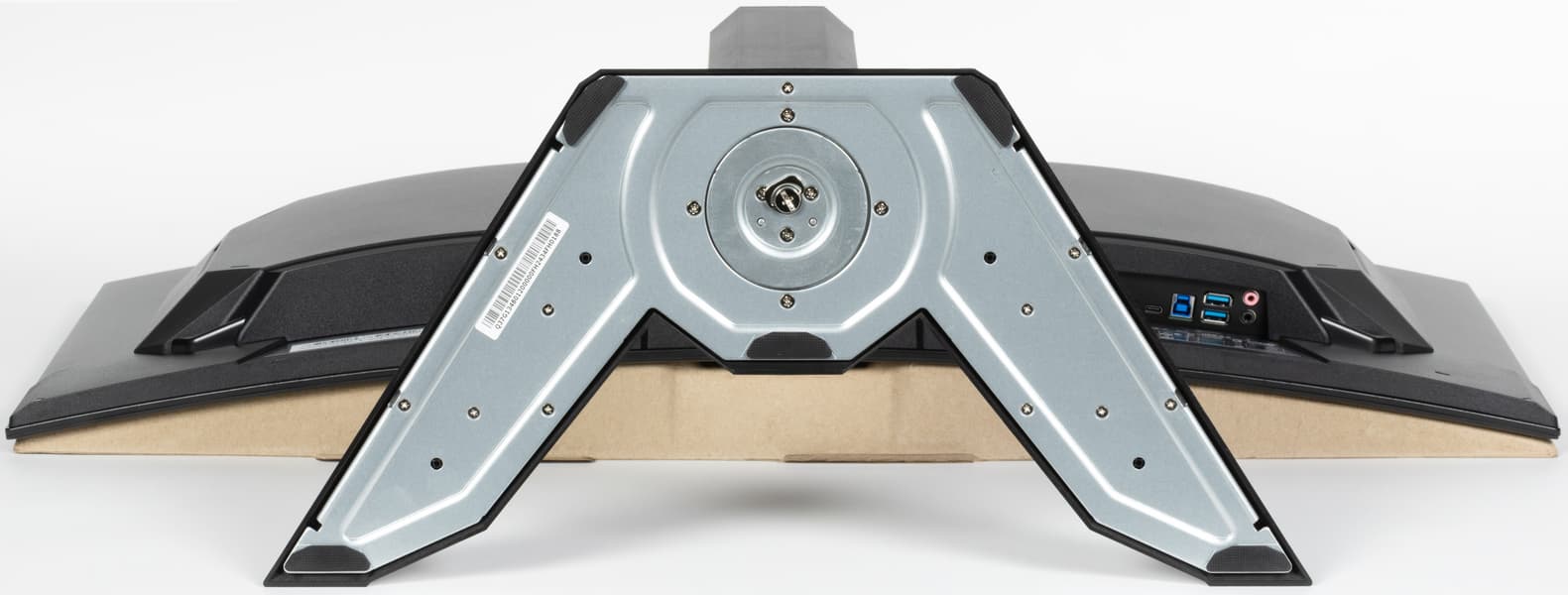 На штатной подставке монитор стоит устойчиво. Несущие элементы подставки изготовлены из толстой штампованной стали и алюминиевого сплава. Конструкция подставки достаточно жесткая. Накладки из резины снизу на основании подставки защищают поверхность стола от царапин и предотвращают скольжение монитора на гладких поверхностях.
