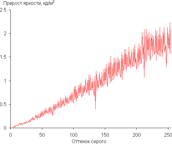 Для оценки характера роста яркости на шкале серого мы измерили яркость 256 оттенков серого (от 0, 0, 0 до 255, 255, 255) при Гамма = Выкл. График ниже показывает прирост (не абсолютное значение!) яркости между соседними полутонами: