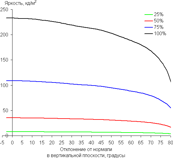 Снижение яркости на 50% от максимального значения достигается только при порядка 79 градусах отклонения. Для сравнения: в случае типичного ЖК-монитора на матрице VA яркость падает вдвое уже примерно при 35°.