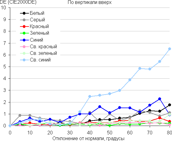 Для количественной характеристики изменения цветопередачи мы провели колориметрические измерения для белого, серого (127, 127, 127), красного, зеленого и синего, а также светло-красного, светло-зеленого и светло-синего полей во весь экран с использованием установки, подобной той, что применялась в предыдущем тесте. Измерения проводились в диапазоне углов от 0° (датчик направлен перпендикулярно к экрану) до 80° с шагом в 5°. Полученные значения интенсивностей были пересчитаны в отклонение ΔE относительно замера каждого поля при перпендикулярном положении датчика относительно экрана. Результаты представлены ниже: