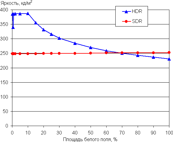 С изменением площади белого максимальная яркость также может меняться, при этом характер зависимости яркости от площади белого участка зависит как минимум от текущего режима — SDR или HDR — и от выбранного профиля. Например, в случае сигнала SDR при выбранном профиле Режим яркость от 0,2% до 100% площади белого сохраняется на уровне порядка 250 кд/м². Тогда как в случае сигнала HDR (профиль по умолчанию) до 10% белого яркость сохраняется на уровне 390 кд/м², после чего начинает плавно снижаться до примерно 230 кд/м² (целевая яркость контента 4000 кд/м²):