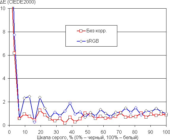 Графики ниже показывают цветовую температуру на различных участках шкалы серого и отклонение от спектра абсолютно черного тела (параметр ΔE) в случае настроек по умолчанию (подписано — Без корр.) и при выборе профиля sRGB (sRGB) без дополнительной коррекции (которая, впрочем, и так невозможна):