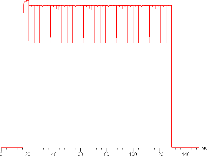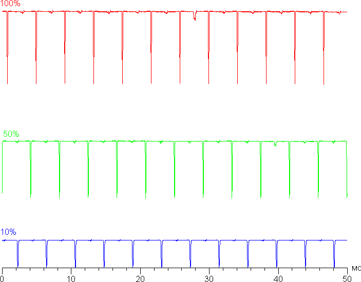 На любом уровне яркости видимое мерцание отсутствует, его не выявляет и тест на стробоскопический эффект. Регистрация зависимости яркости от времени при различных уровнях яркости выявила модуляцию яркости с очень высоким коэффициентом заполнения, что и объясняет отсутствие мерцания. В доказательство приведем графики зависимости яркости (вертикальная ось) от времени (горизонтальная ось) при различных значениях настройки Яркость в случае белого поля на 10% от площади экрана.