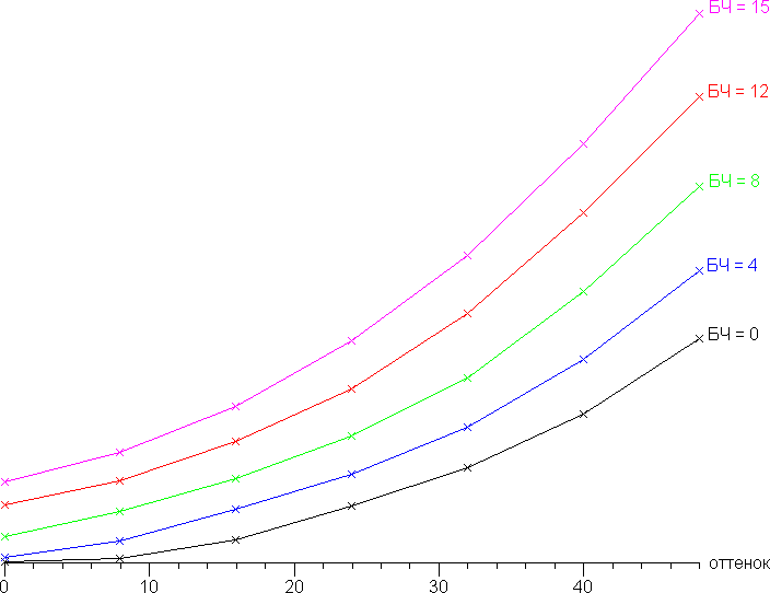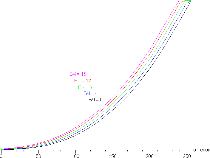 Дополнительной настройкой Баланс черного 2.0 (сократим до БЧ, значения от 0 до 15, по умолчанию 0) можно скорректировать гамма-кривую, улучшая различимость деталей в тенях. Это может быть полезно в играх с темными сценами. Ниже приведены гамма-кривые при нескольких значениях БЧ (построенные по 33 точкам):