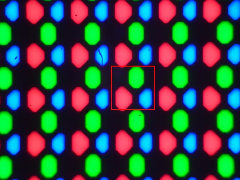 В данном экране используется матрица типа QD-OLED — активная матрица на органических светодиодах. Полноцветное изображение создается с помощью субпикселей трех цветов — красного (R), зеленого (G) и синего (B) в равном количестве — по три разного вида на пиксель. Каждый субпиксель имеет свой независимо управляемый OLED-источник синего света, а красный и зеленый цвета формируются с помощью светофильтров на квантовых точках (QD — Quantum Dots), размещенных перед этими источниками. Синий субпиксель светофильтра, разумеется, не имеет. Упрощенная схема ниже поясняет устройство QD-OLED: