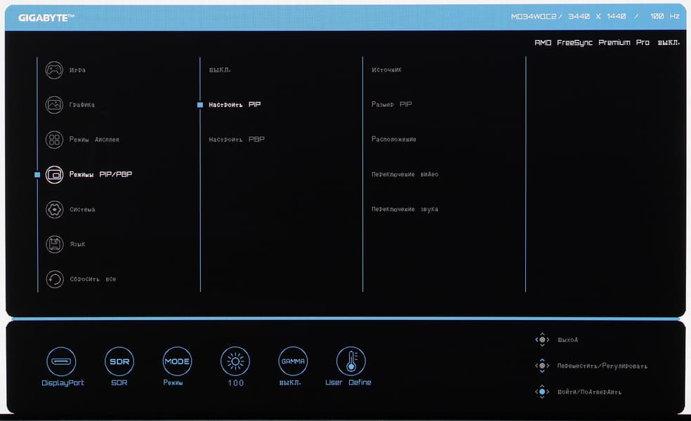 Присутствуют функции картинка-в-картинке (PIP) и картинка-рядом-с-картинкой (PBP). В режиме PIP выбирается положение дополнительного окна в одном из четырех углов, а также его размер из трех возможных. В режиме PBP можно получить два изображения 1720×1440 с выводом точка в точку от независимых источников с заполнением всей области отображения.
