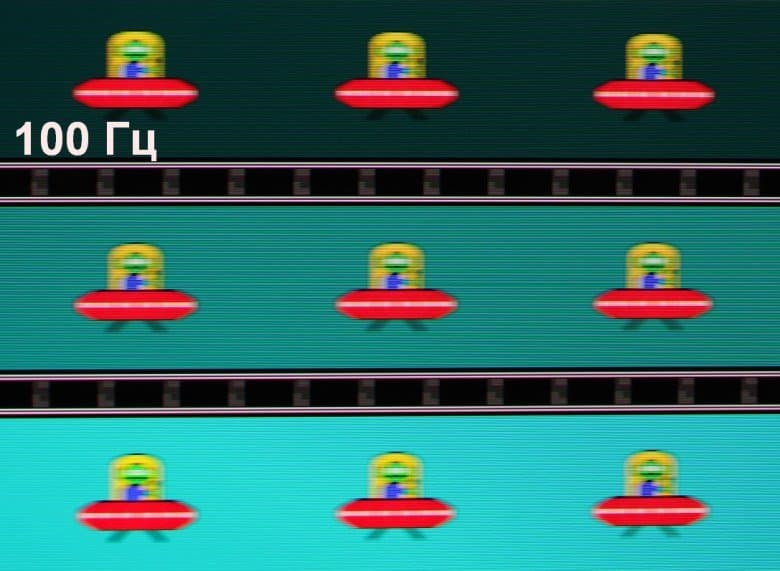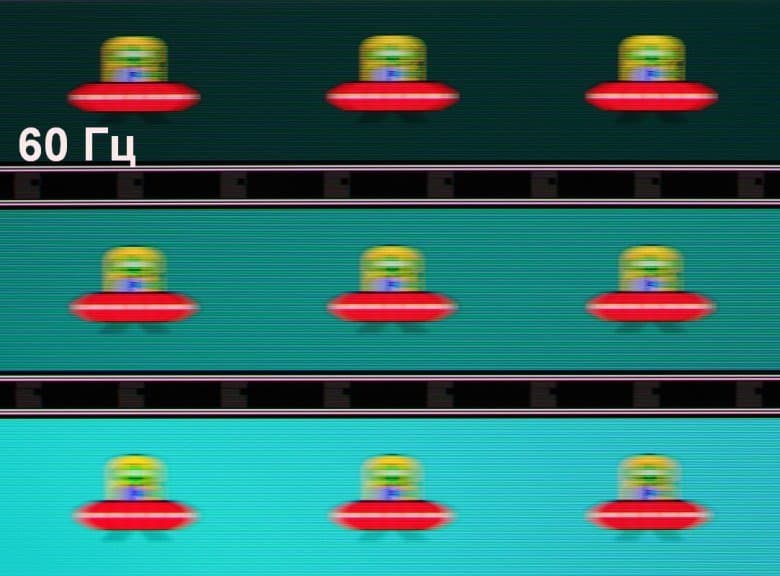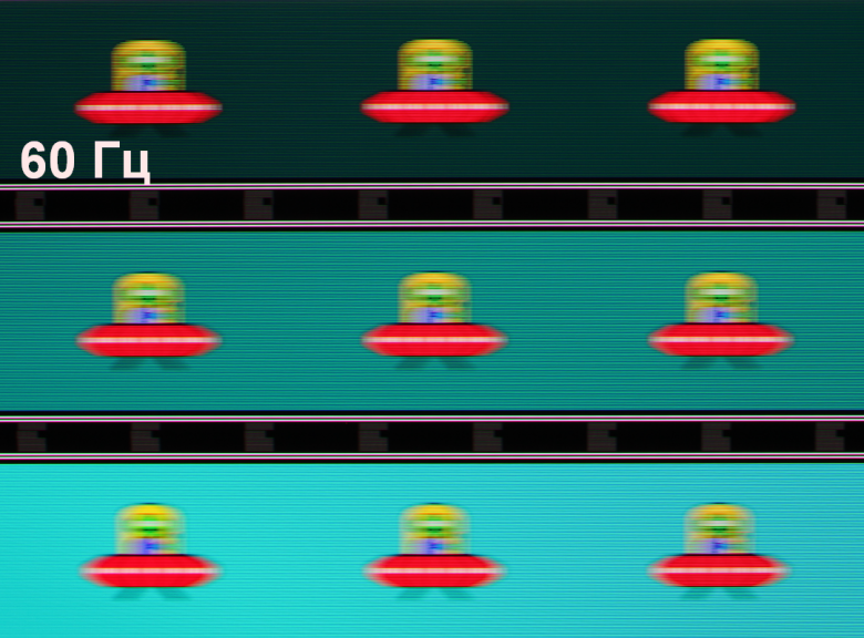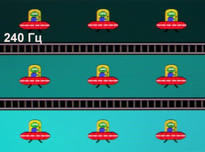 Для наглядного представления о том, что на практике означает такая скорость матрицы приведем серию снимков, полученных с помощью движущейся камеры. Такие снимки показывают, что видит человек, если он следит глазами за двигающимся на экране объектом. Описание теста приведено тут, страница с самим тестом тут. Использовались рекомендованные установки (скорость движения 960 пиксель/с для частот 60 и 240 Гц, 1000 пиксель/с для 100 Гц), выдержка 1/15 с. На фотографиях указаны значения частоты обновления:
