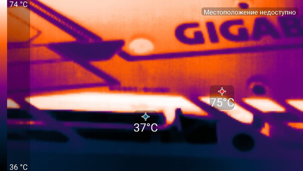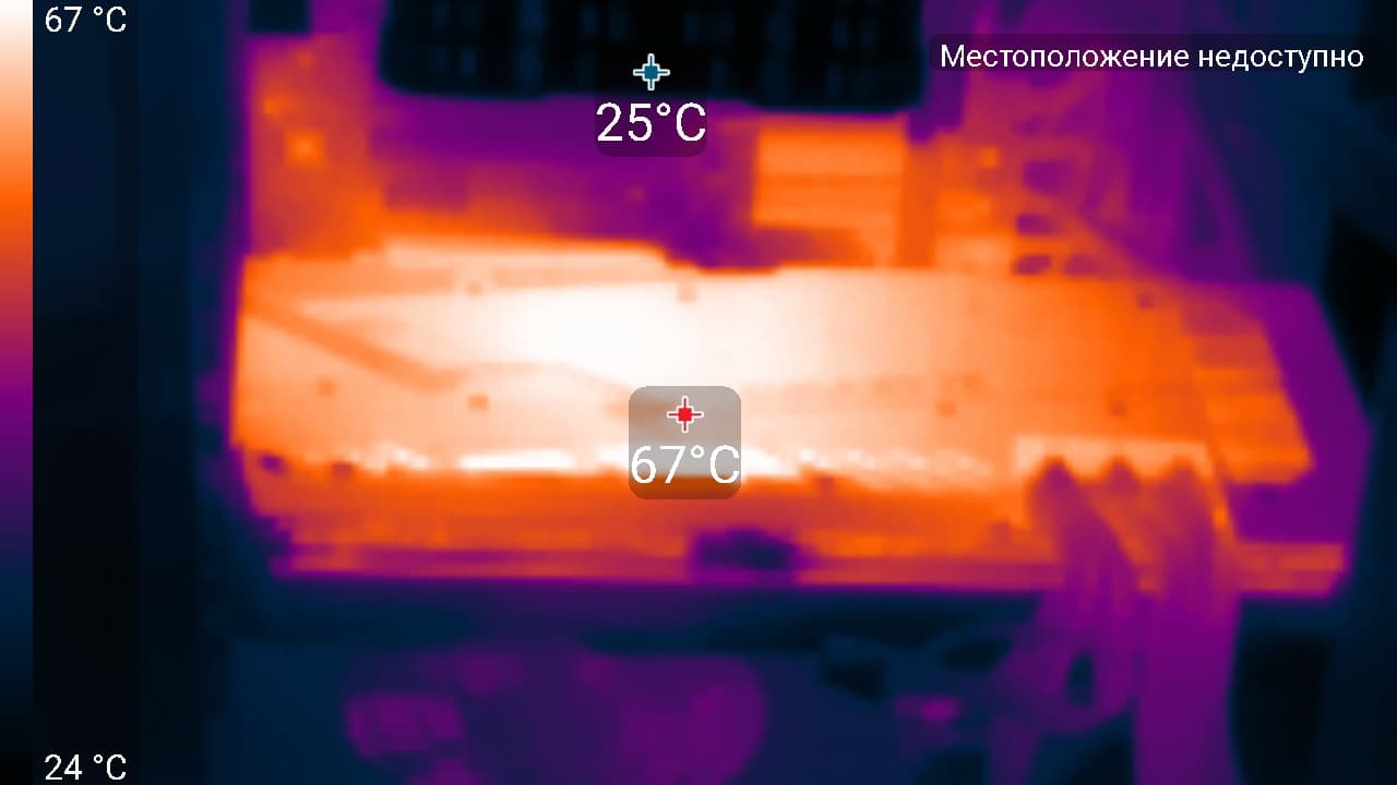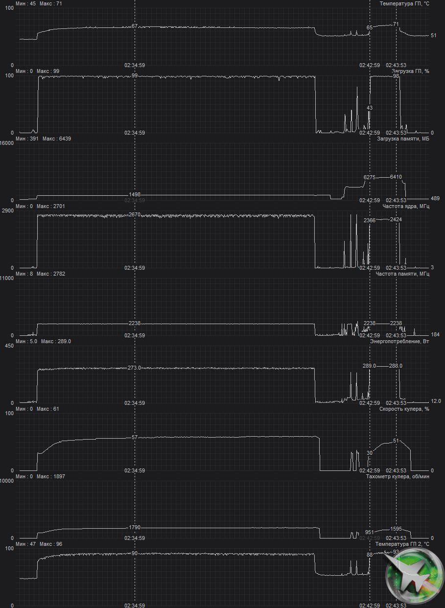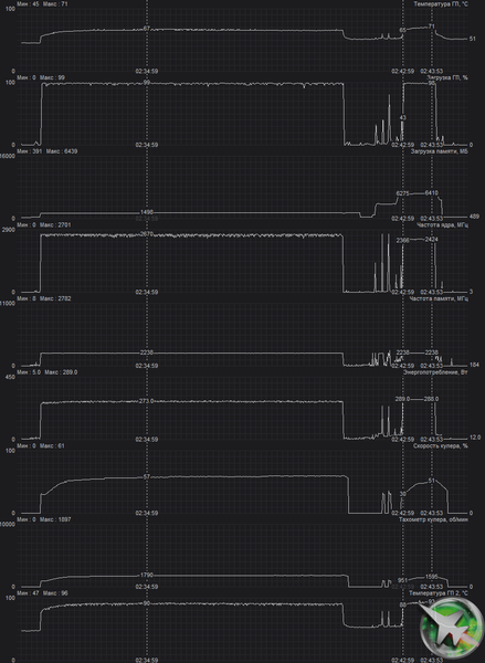 После 2-часового прогона под нагрузкой максимальная температура ядра не превысила 71 градус (памяти — 82°С), что является очень хорошим результатом для видеокарт такого уровня. Максимальная мощность была зафиксирована на уровне 289 Вт, а максимальный нагрев наблюдался в центре PCB, и основным источником нагрева является графический процессор.