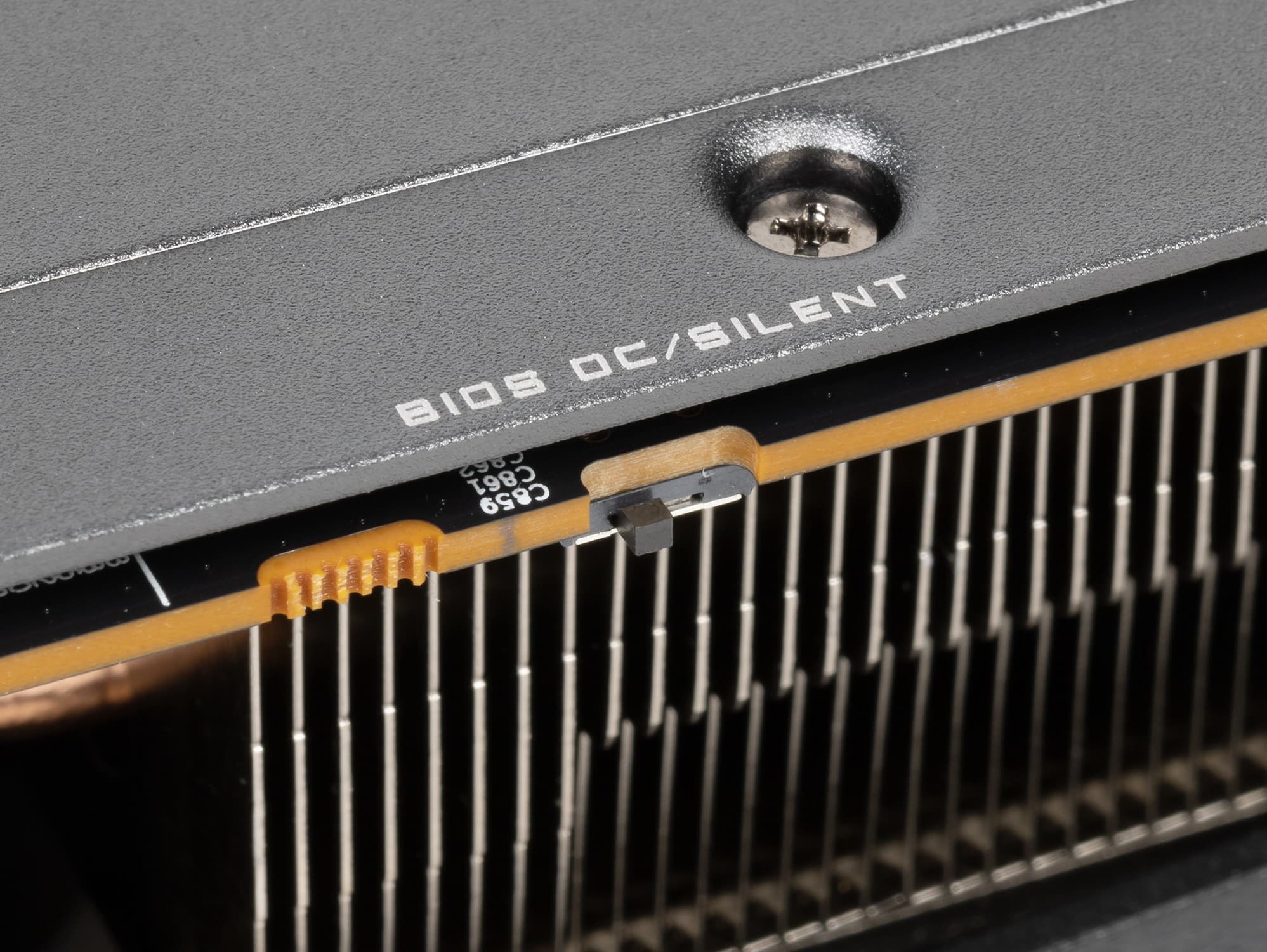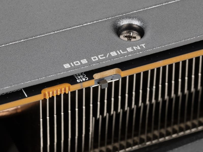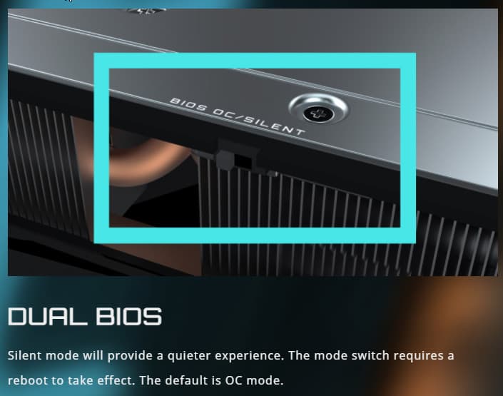 Карта имеет двойной BIOS, что традиционно для многих решений Gigabyte. На торце карты есть переключатель, в разных версиях BIOS (они названы OC mode и Silent mode — разогнанный и тихий режимы соответственно) заданы разные кривые работы вентиляторов.