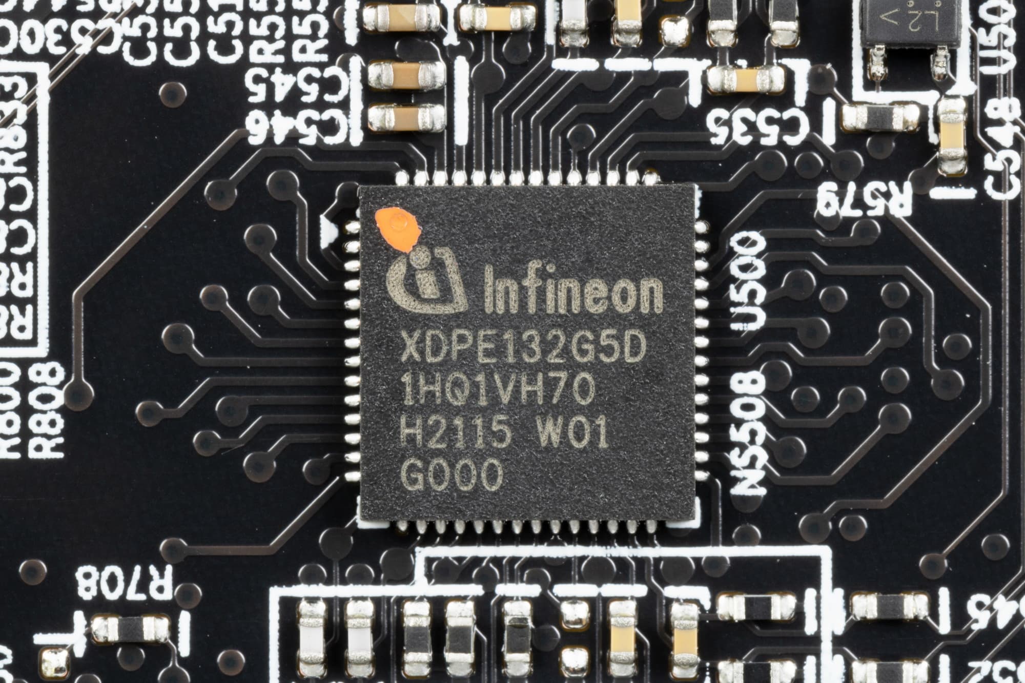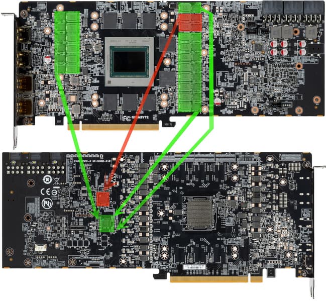 Зеленым цветом отмечена схема питания ядра, красным — памяти. Мы снова видим весьма дорогой 16-фазный ШИМ-контроллер XDPE132G5D (Infineon), который в данном случае управляет 15 фазами питания GPU (сам контроллер расположен на оборотной стороне PCB).