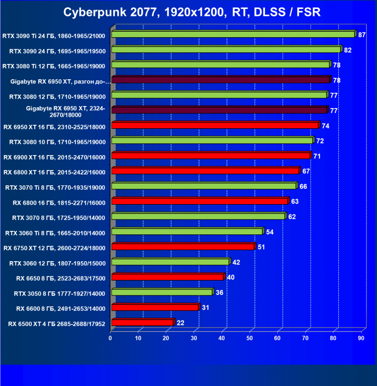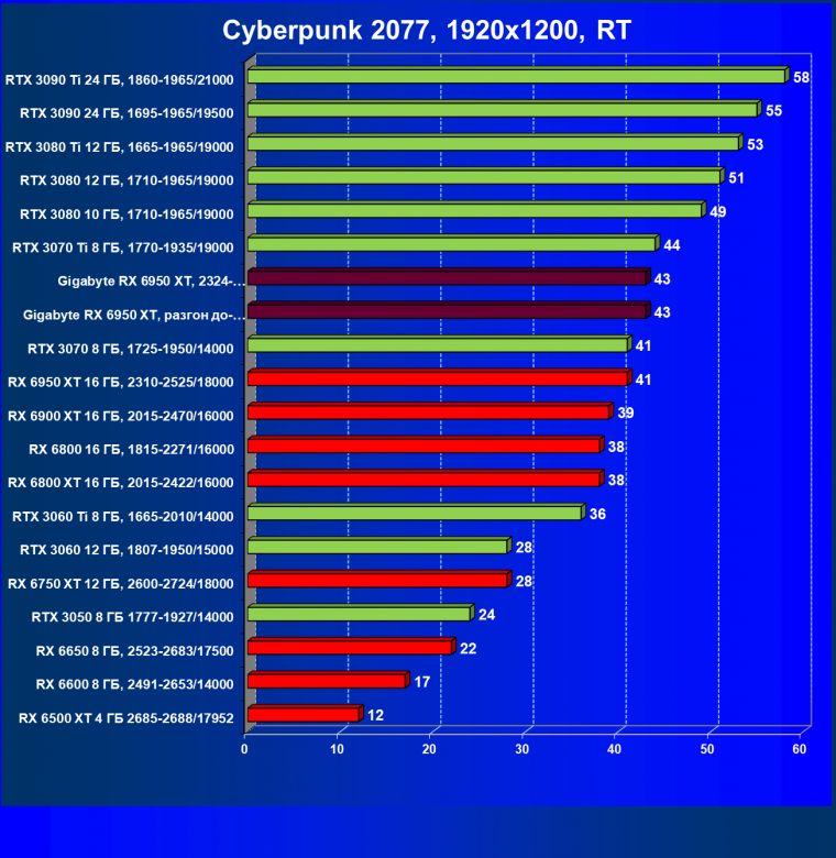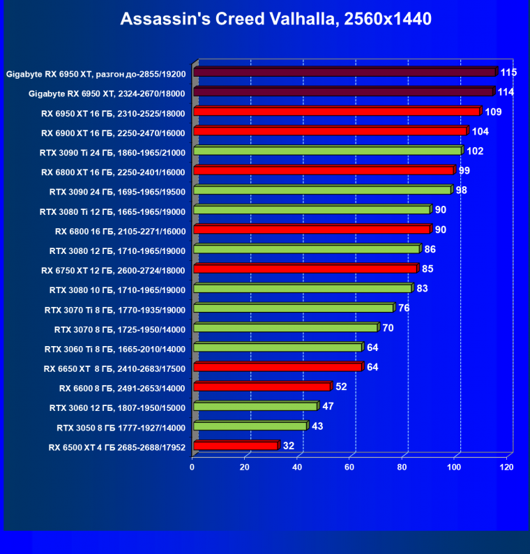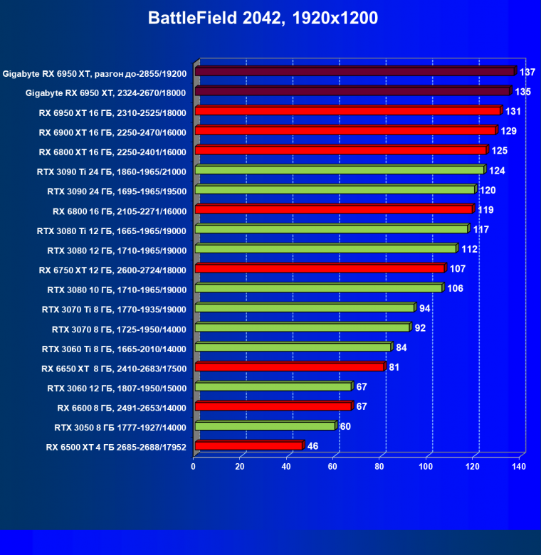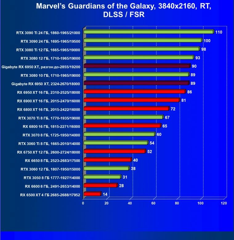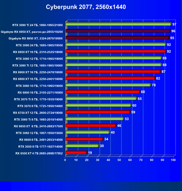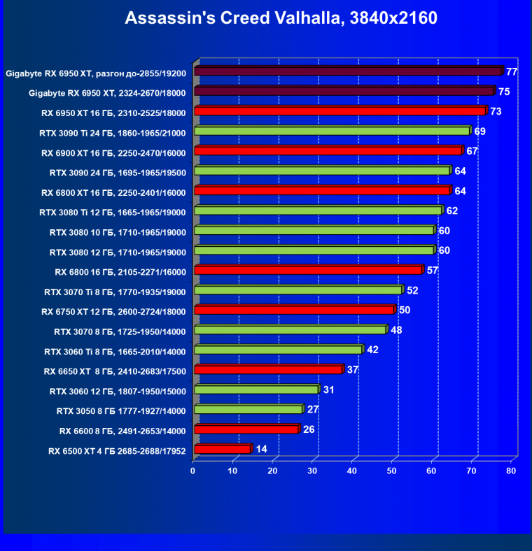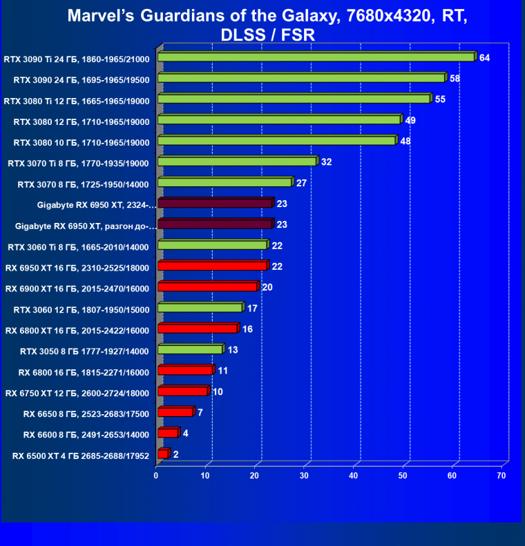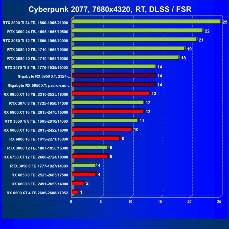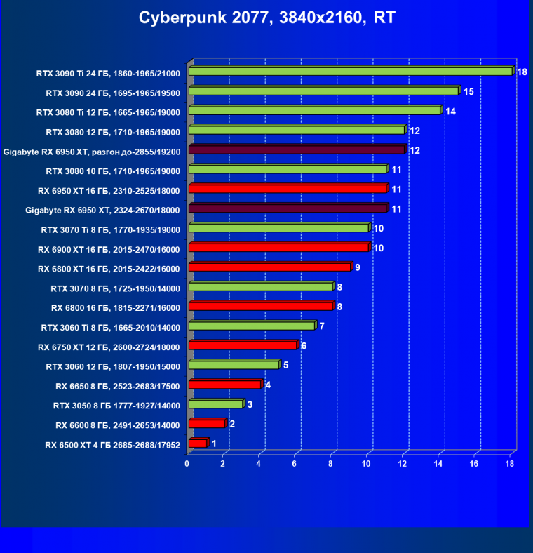 | 14 | Gigabyte RX 6950 XT, 2324—2670/18000 | 71 | 704 | 99 000 |