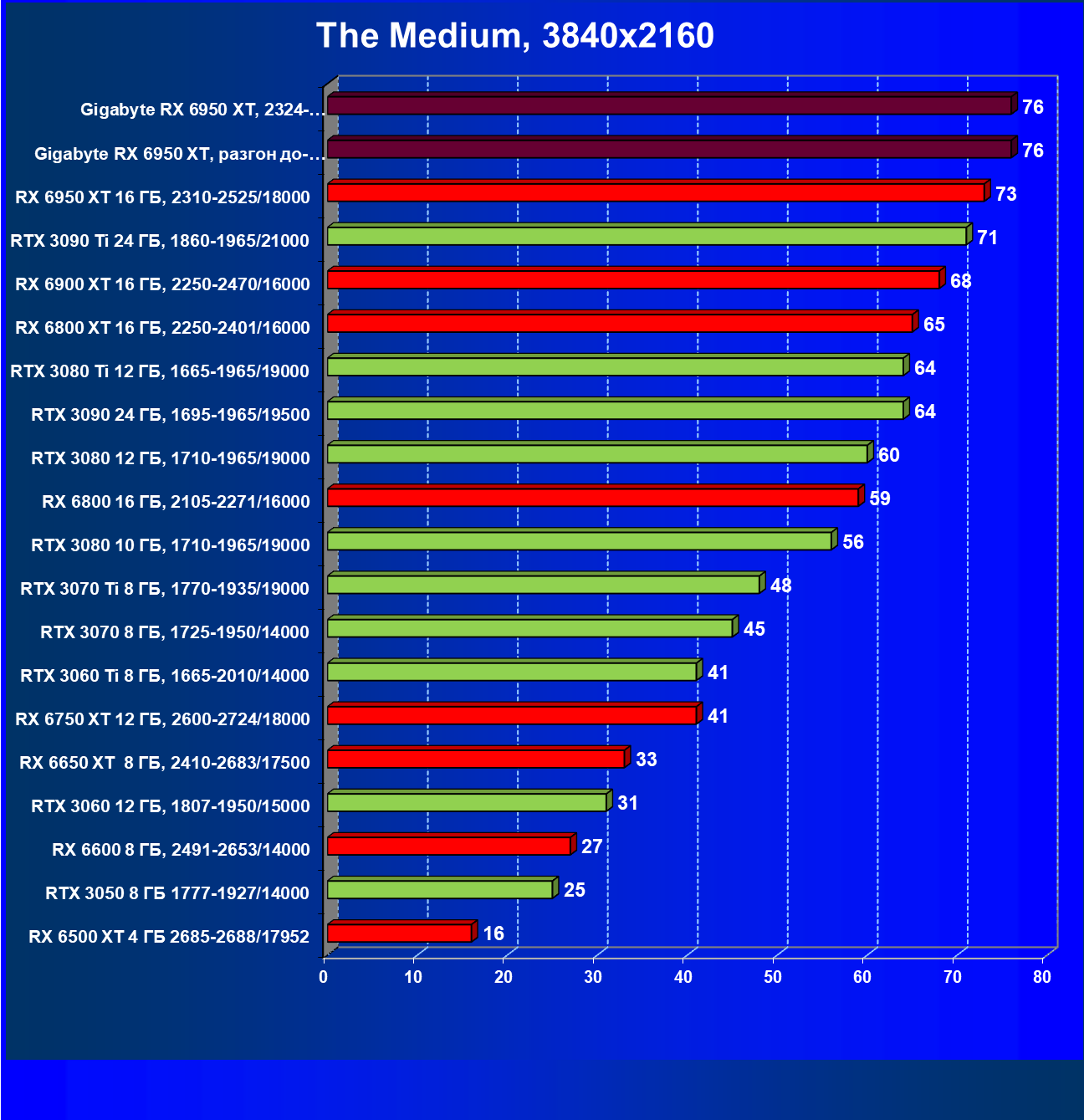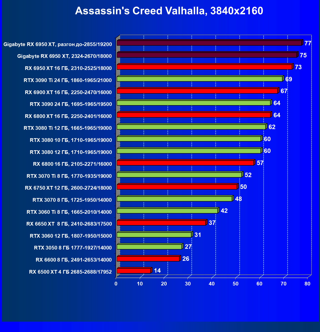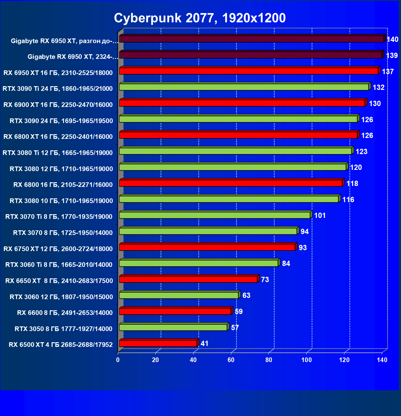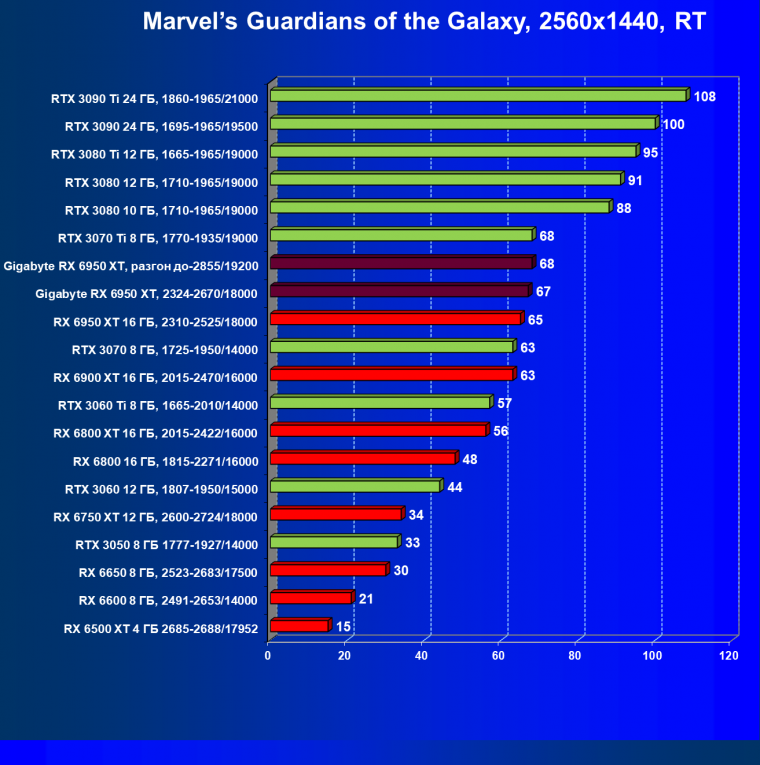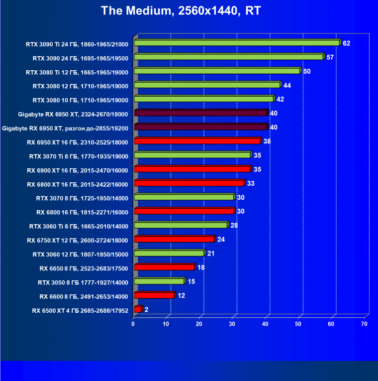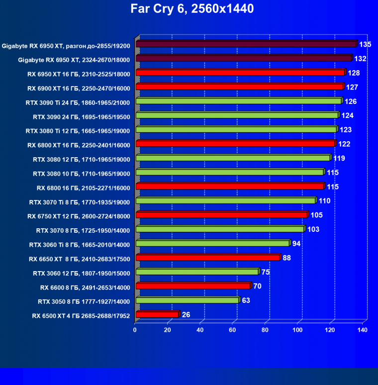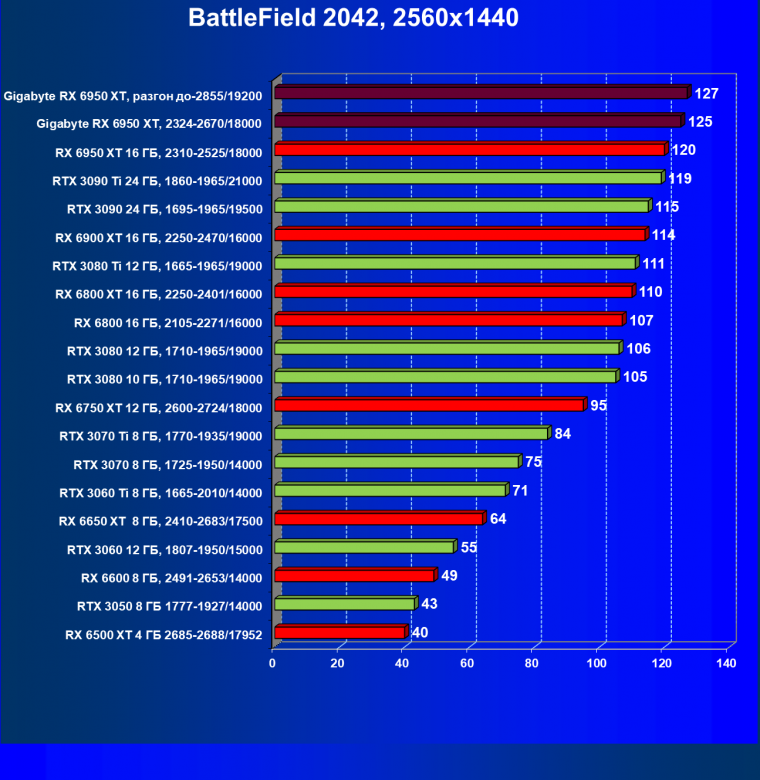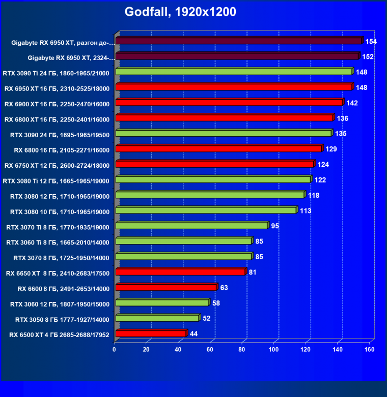 | 14 | Gigabyte RX 6950 XT, 2324—2670/18000 | 71 | 704 | 99 000 |