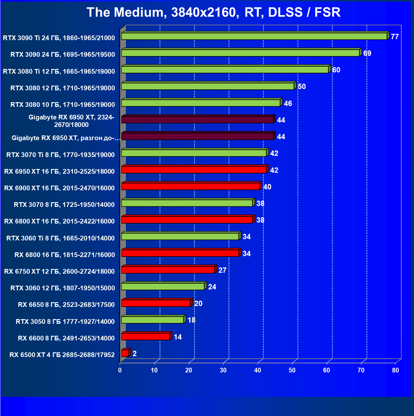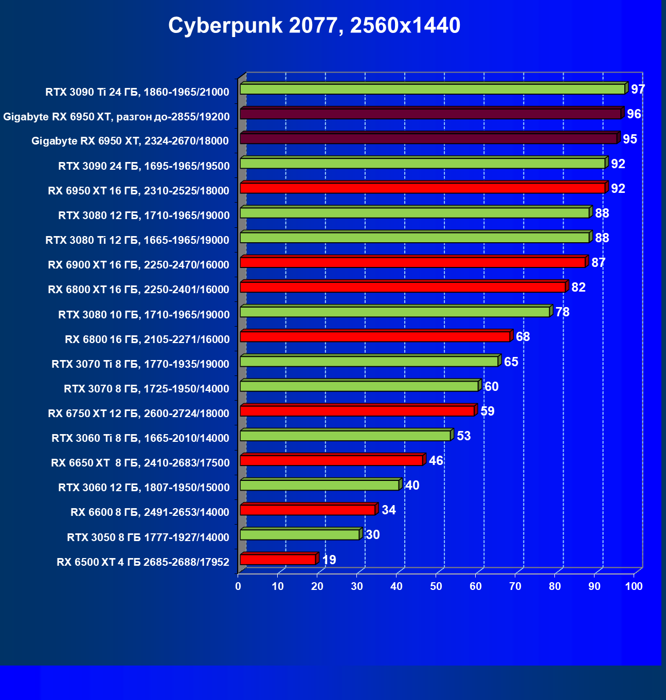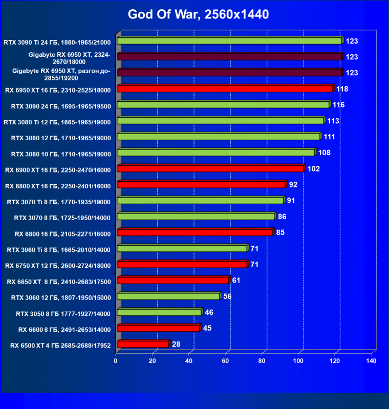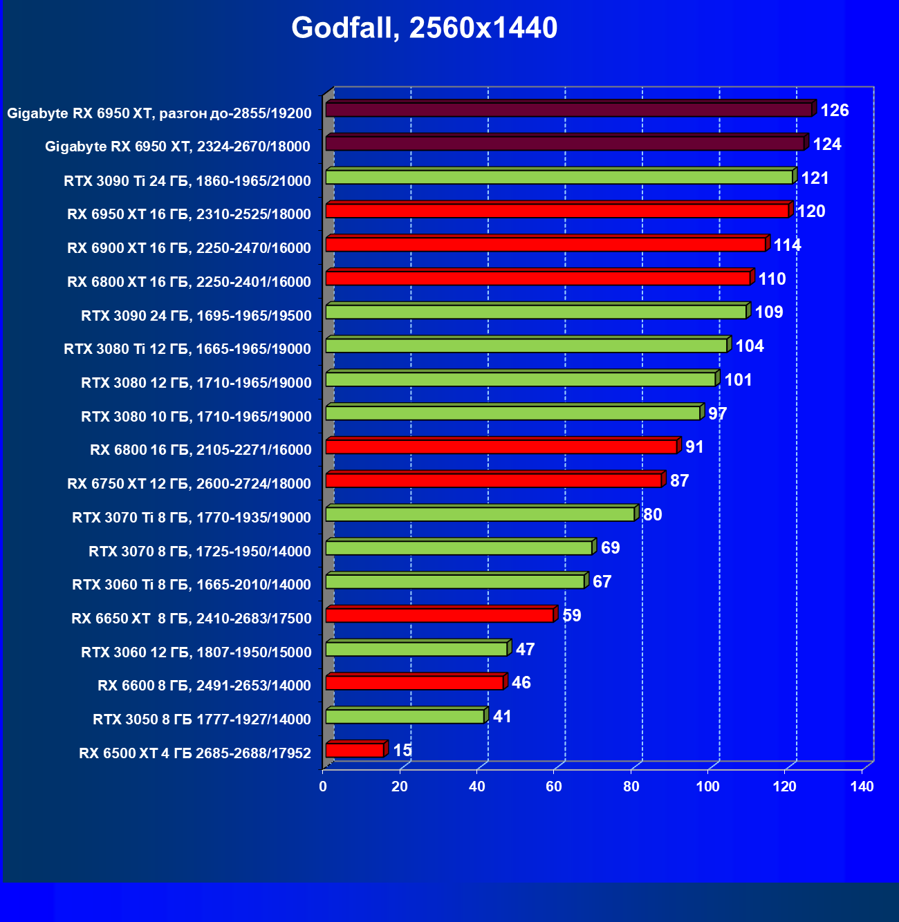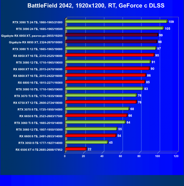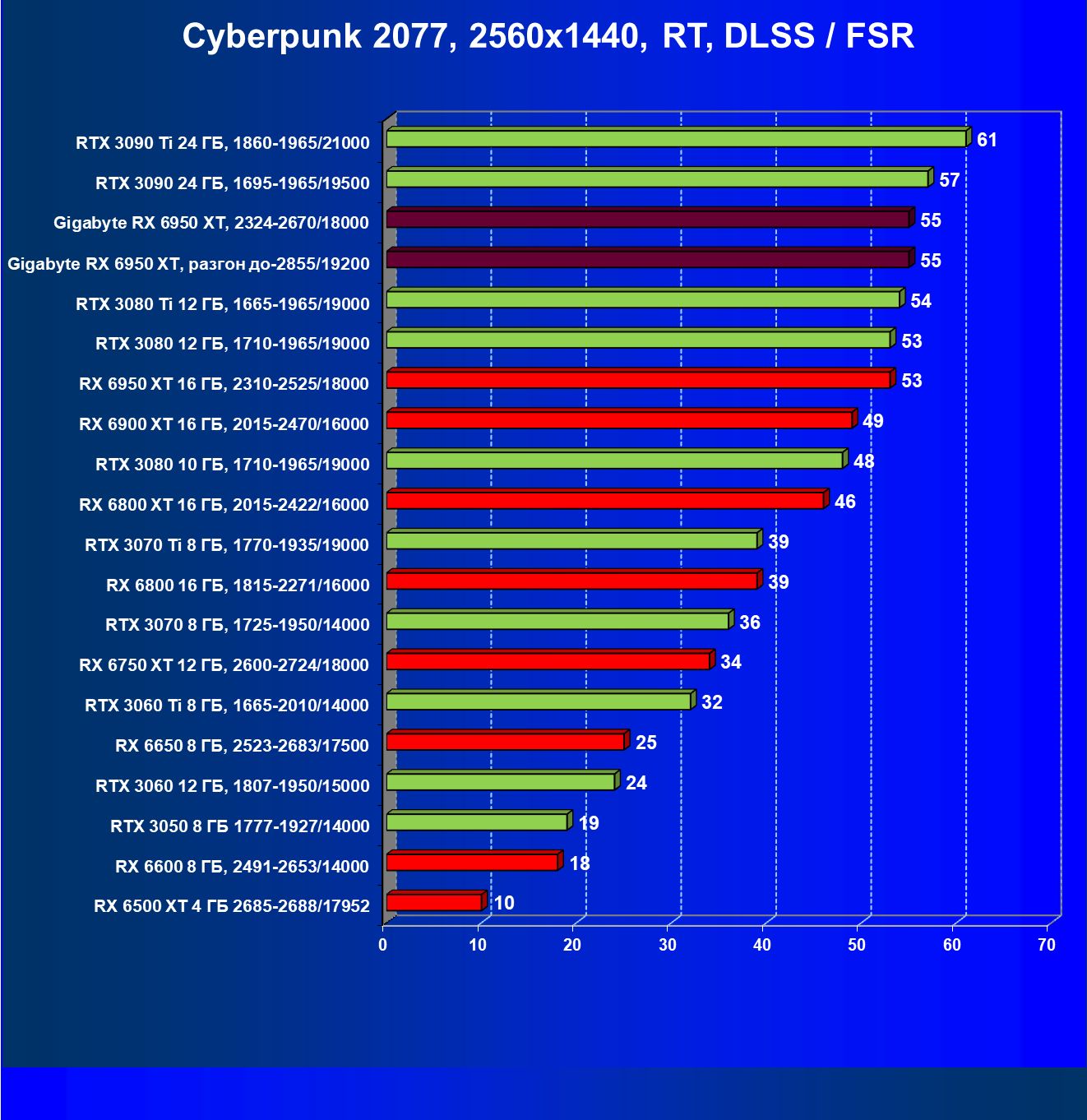 | 14 | Gigabyte RX 6950 XT, 2324—2670/18000 | 71 | 704 | 99 000 |