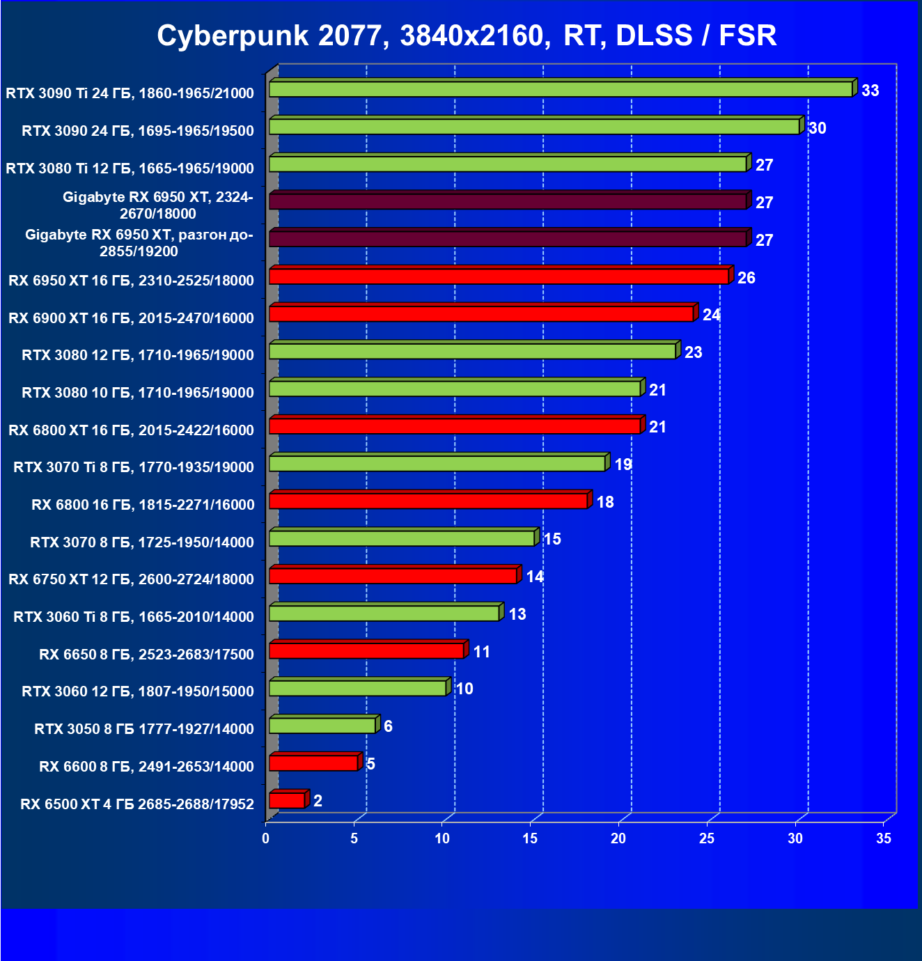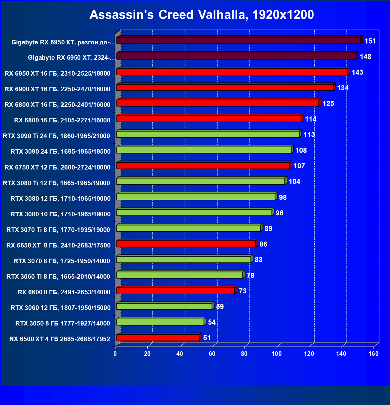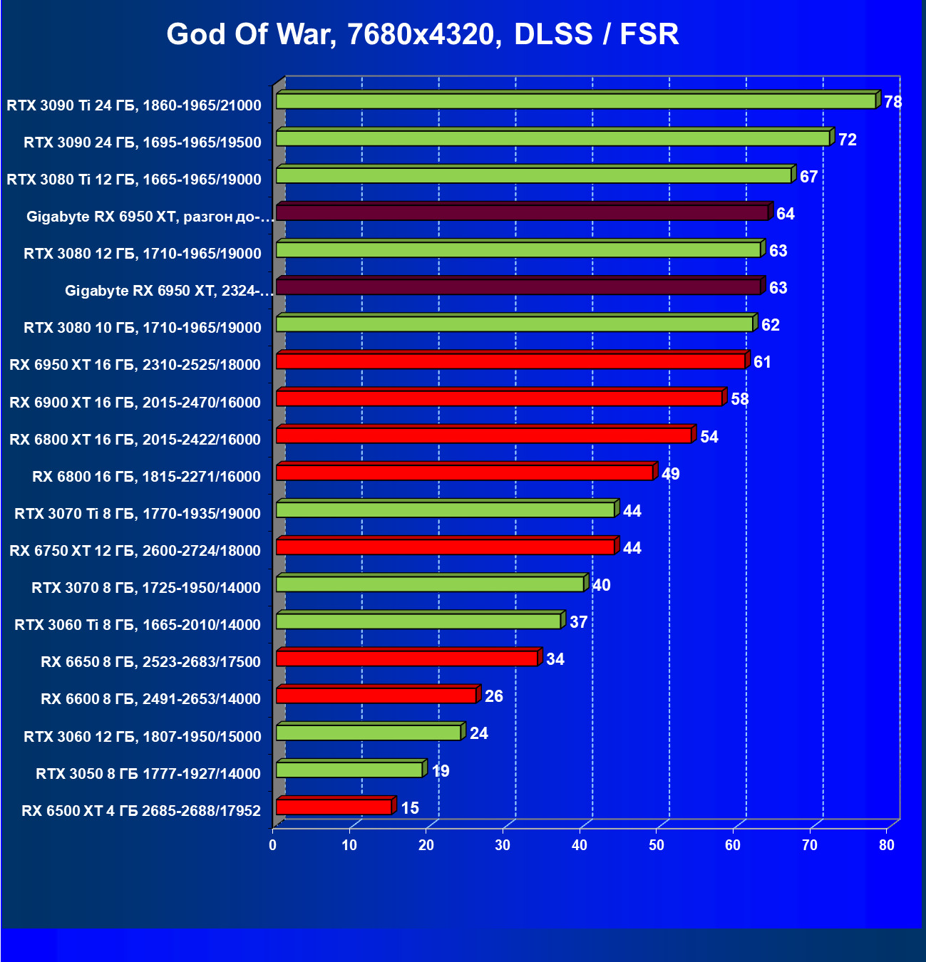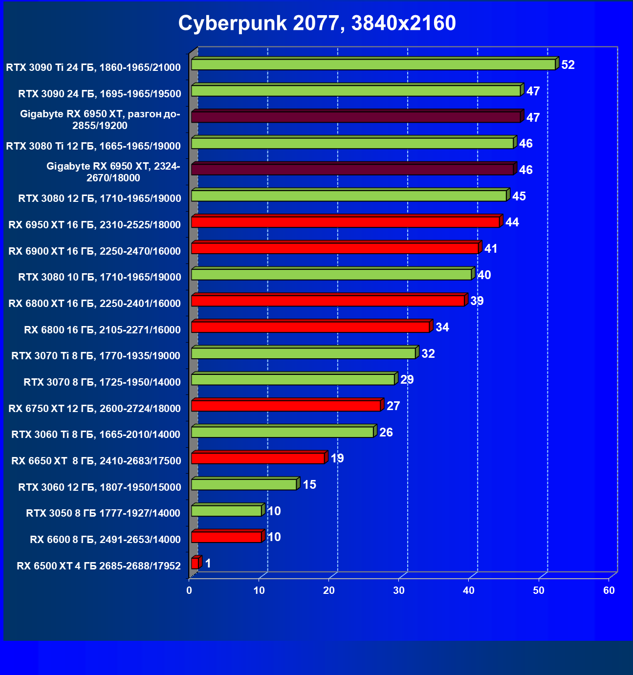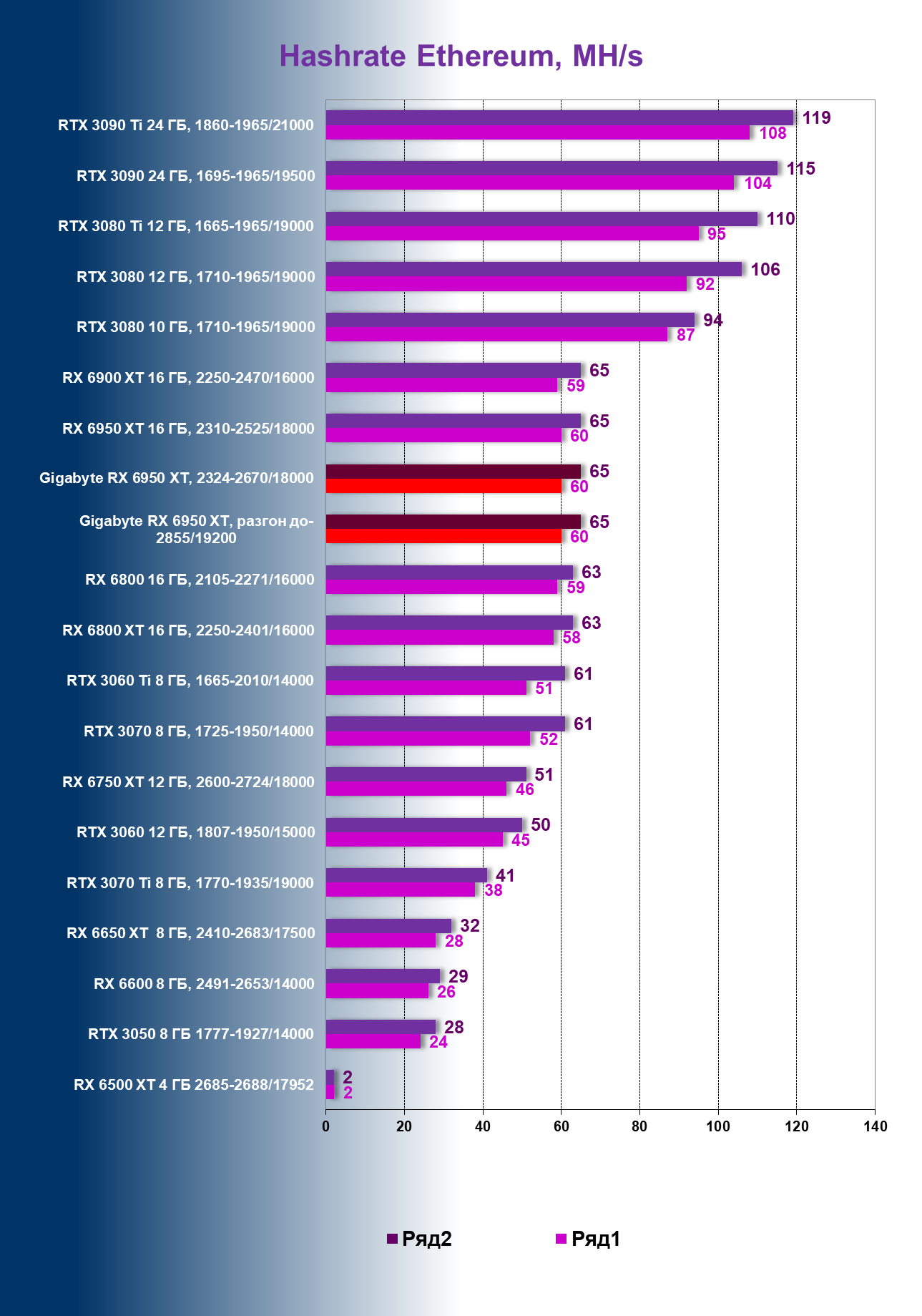 | 14 | Gigabyte RX 6950 XT, 2324—2670/18000 | 71 | 704 | 99 000 |