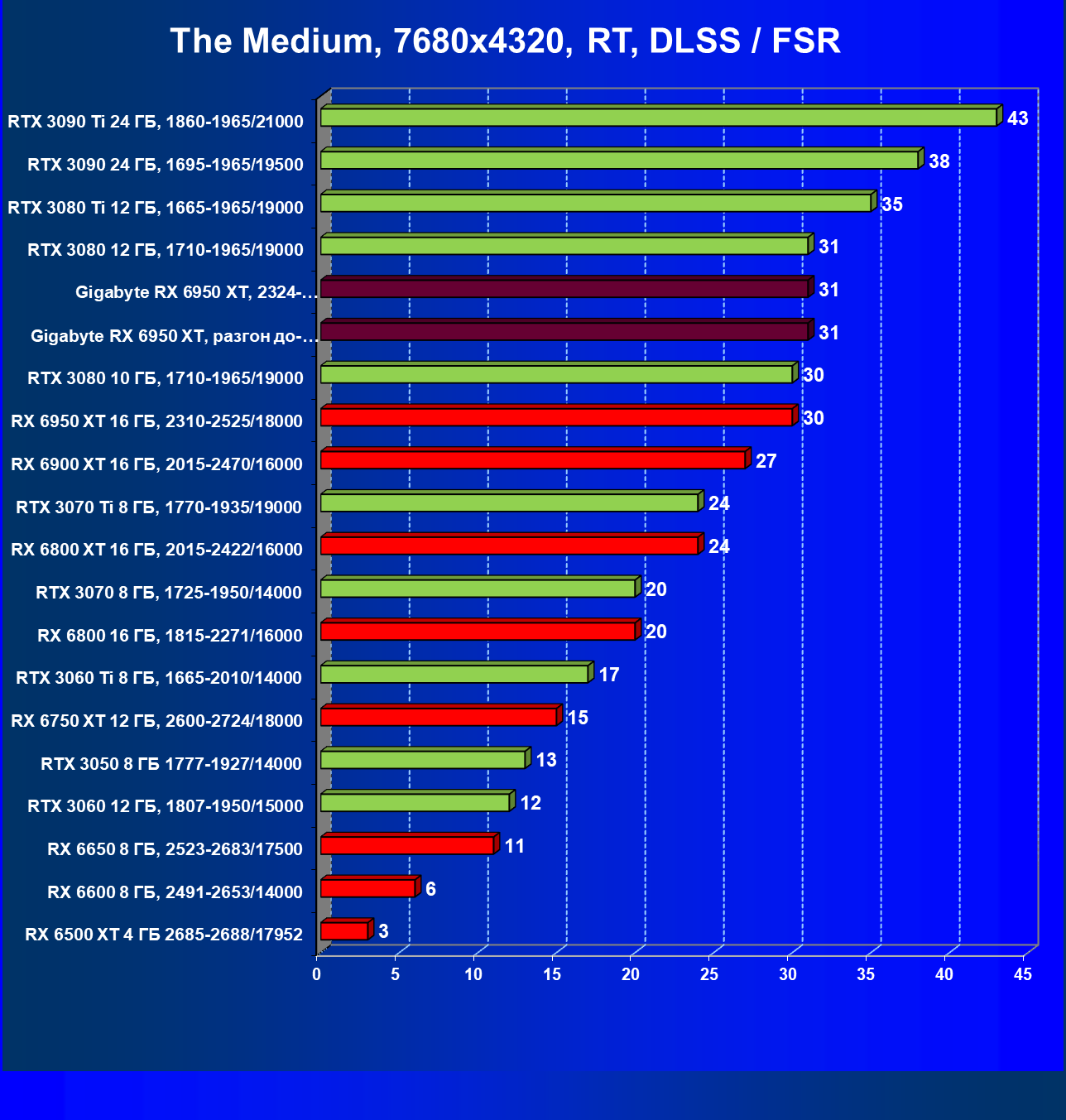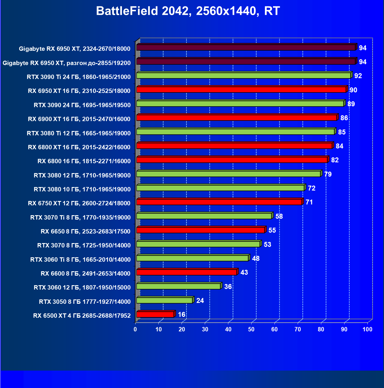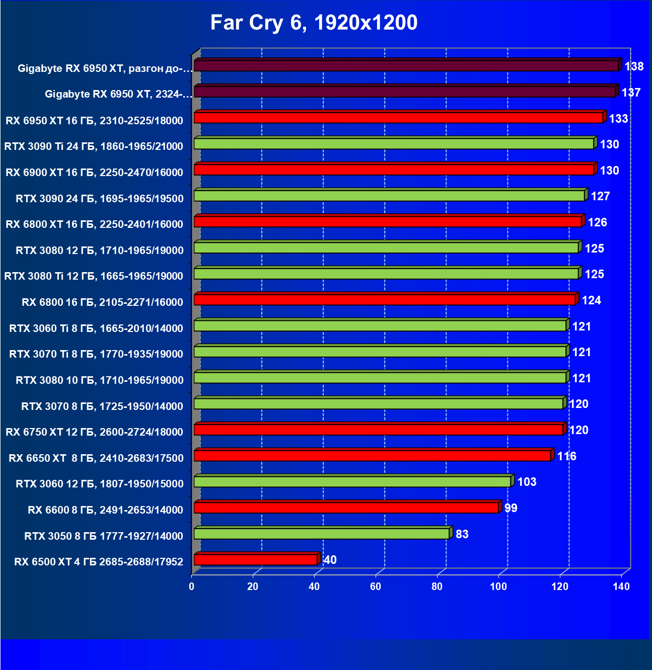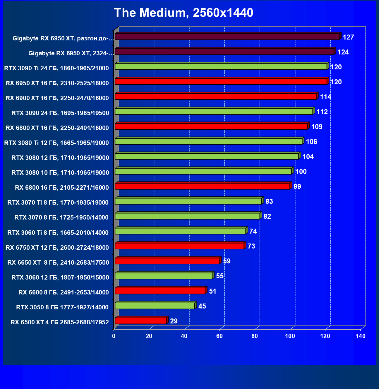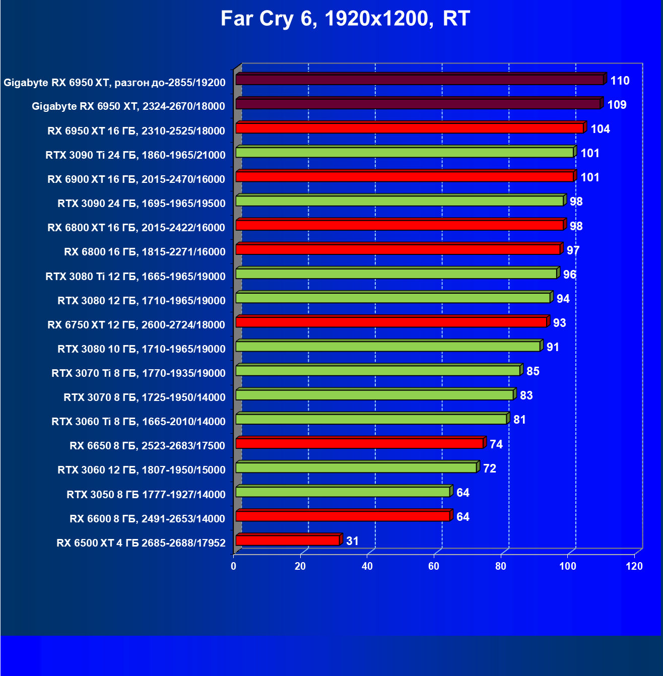 | 14 | Gigabyte RX 6950 XT, 2324—2670/18000 | 71 | 704 | 99 000 |