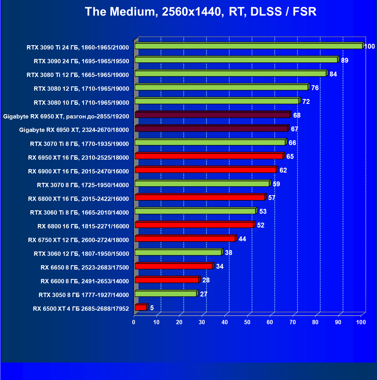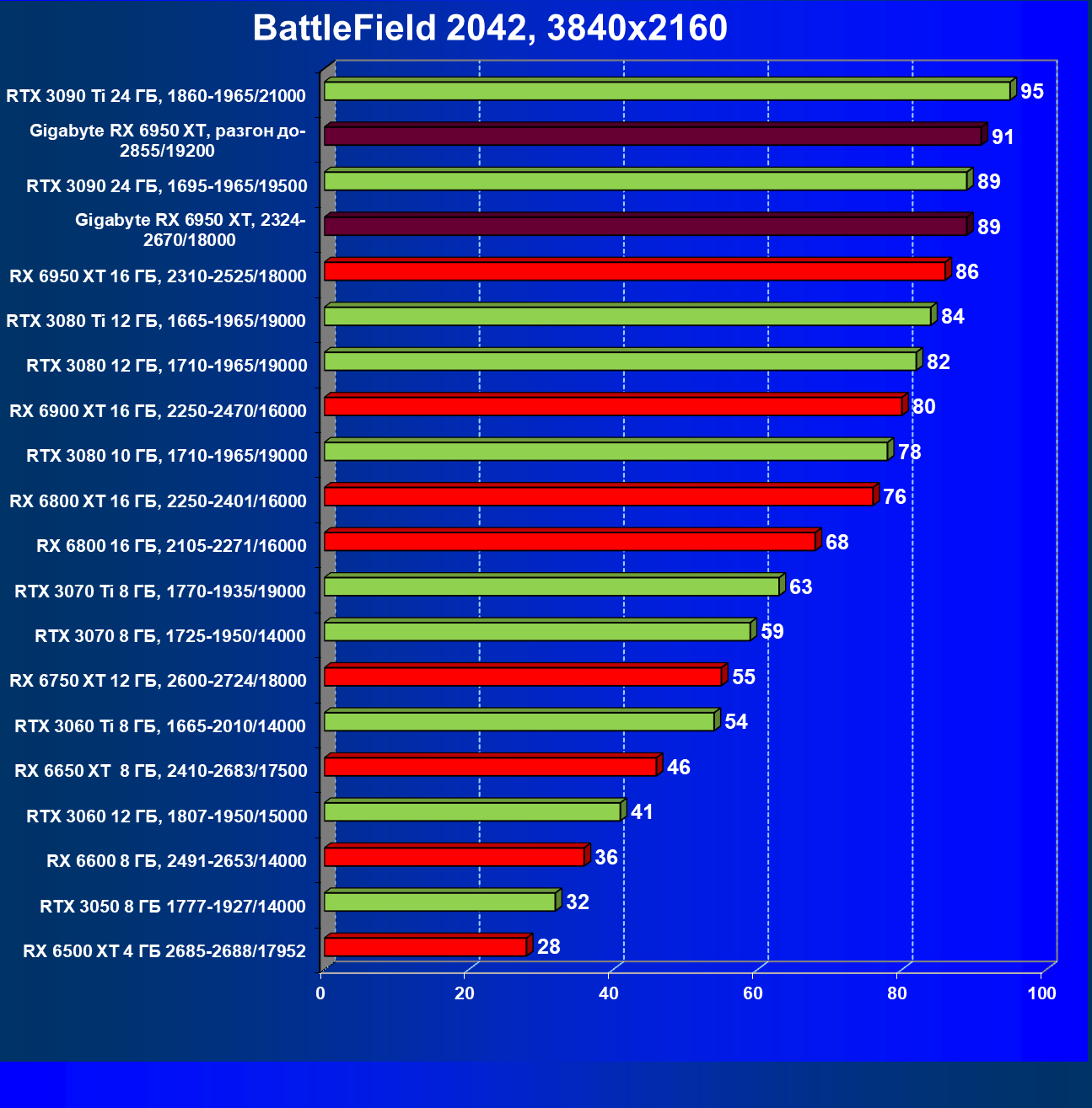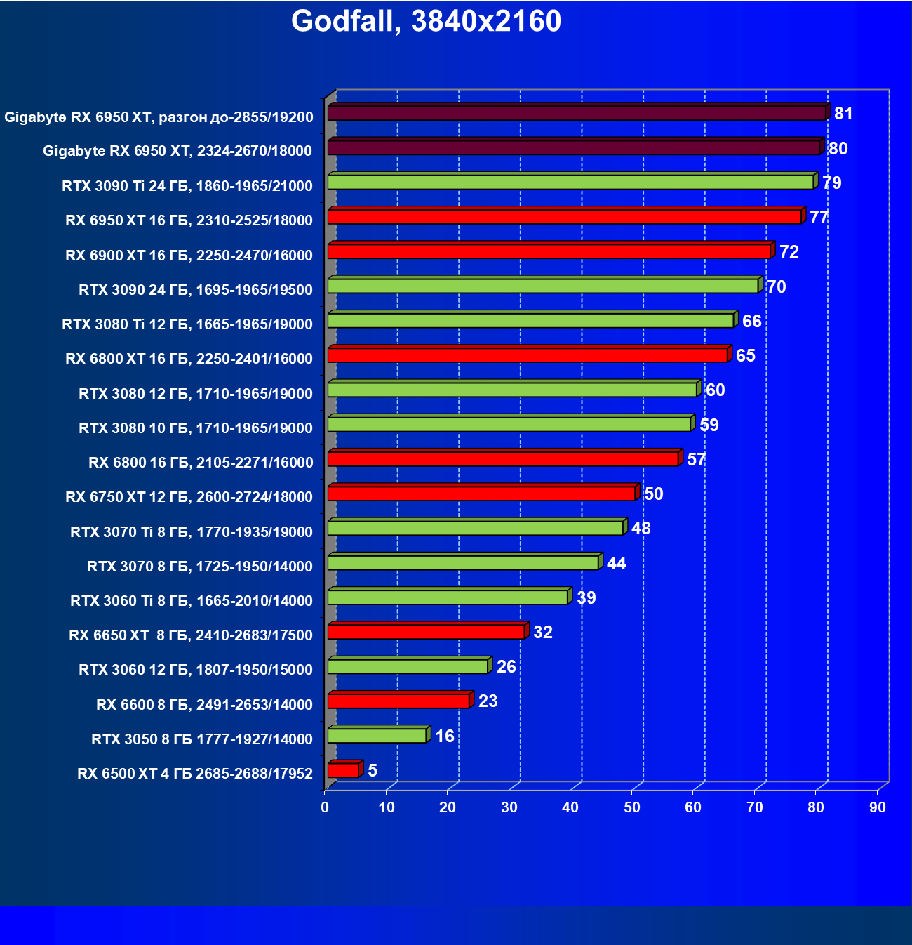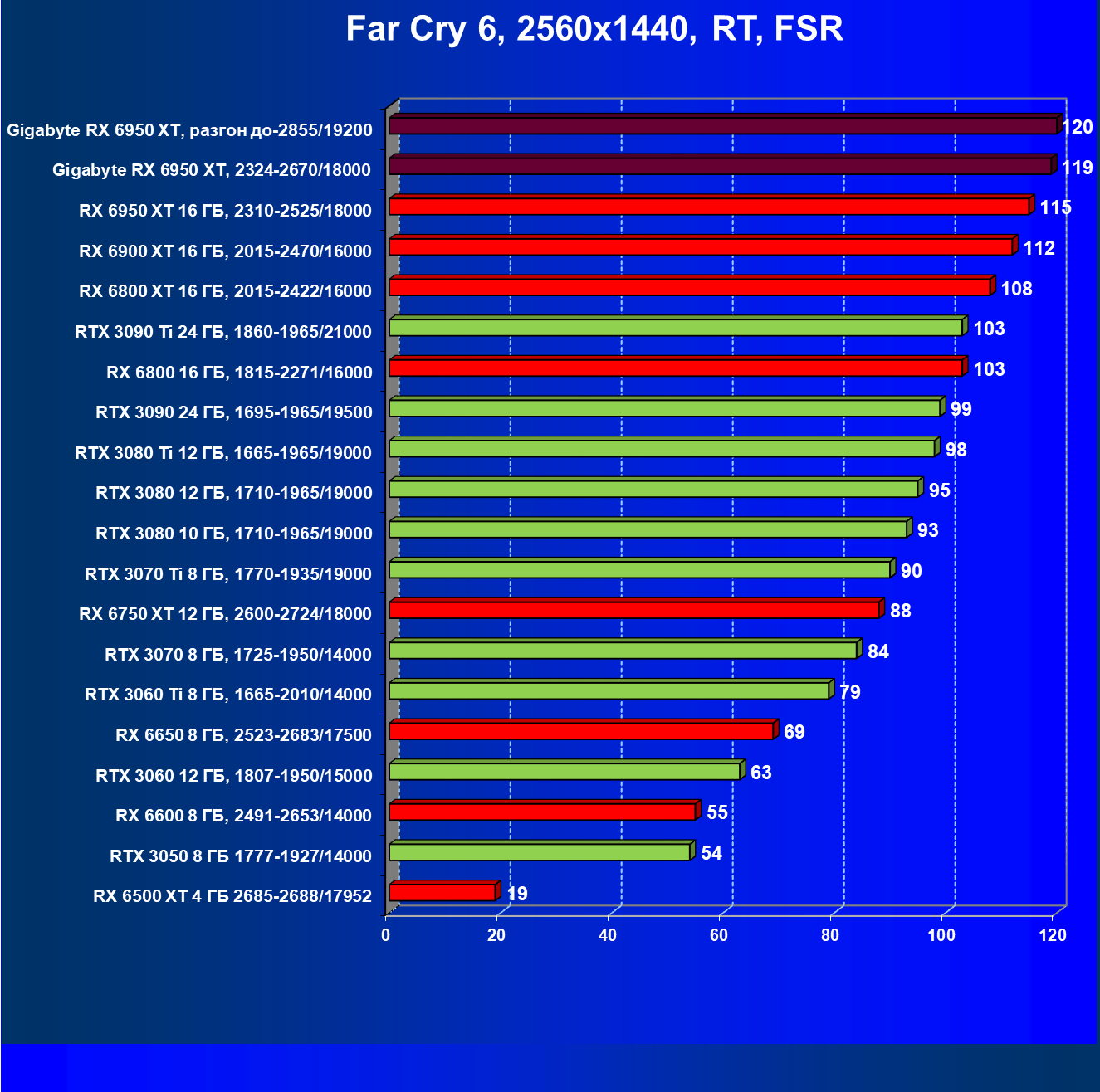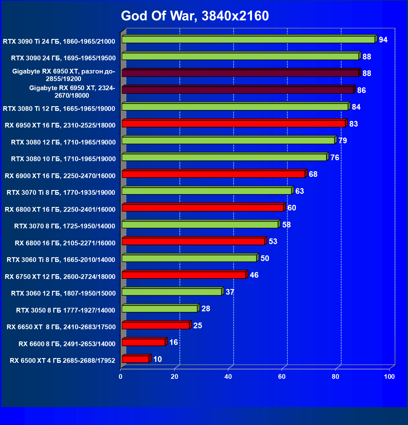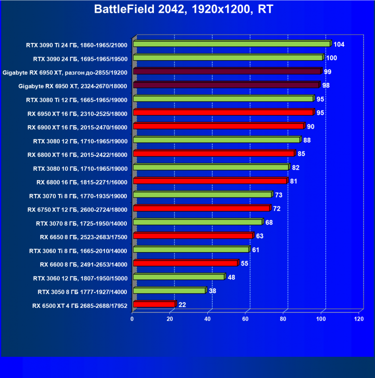 | 14 | Gigabyte RX 6950 XT, 2324—2670/18000 | 71 | 704 | 99 000 |