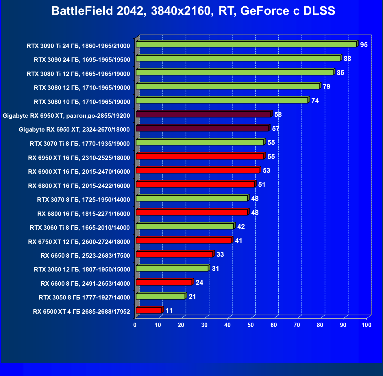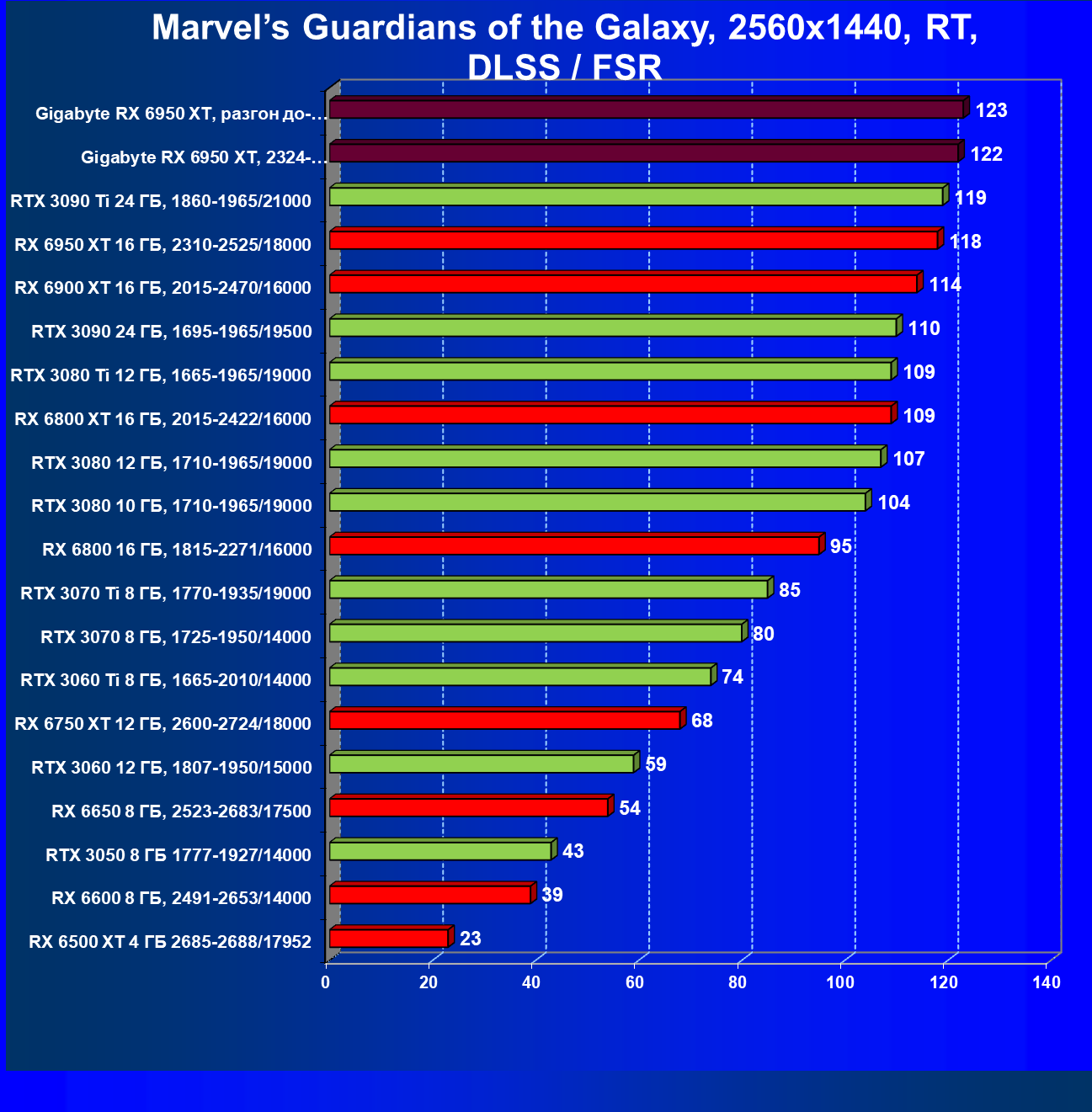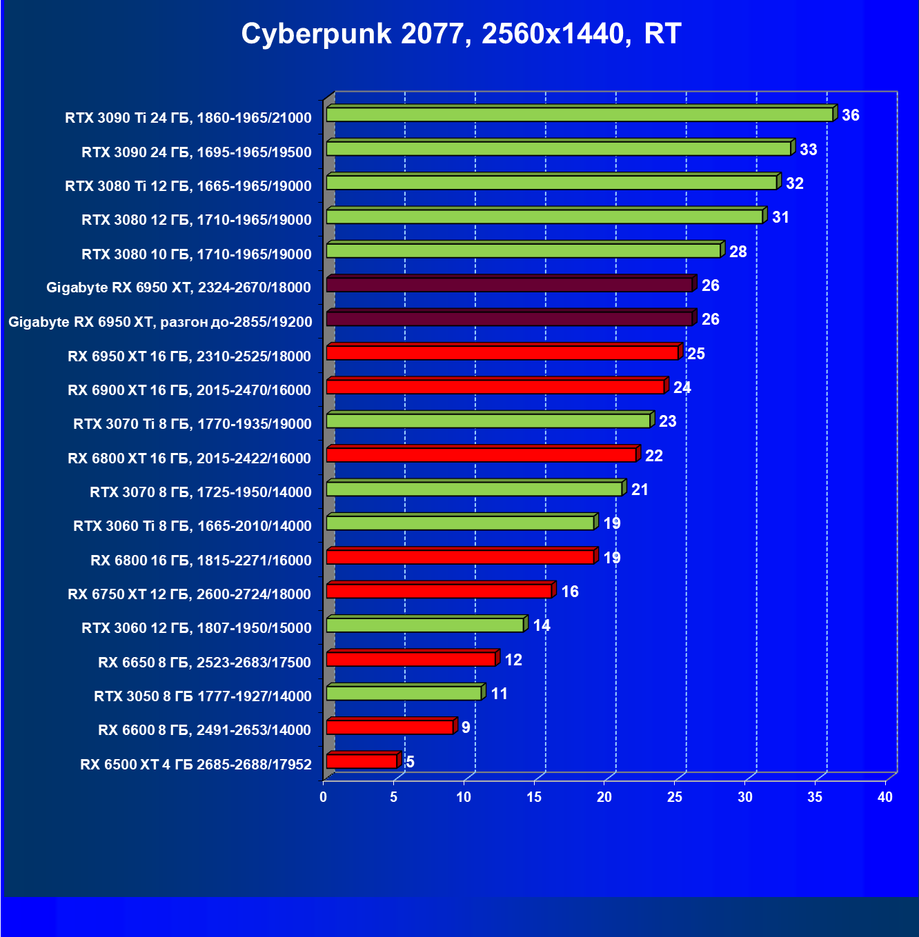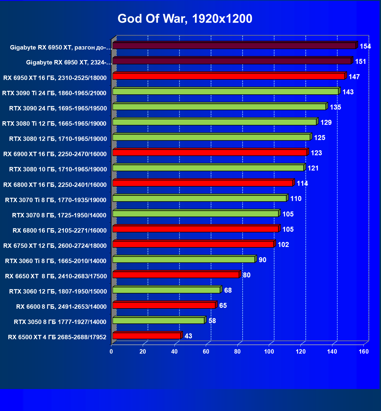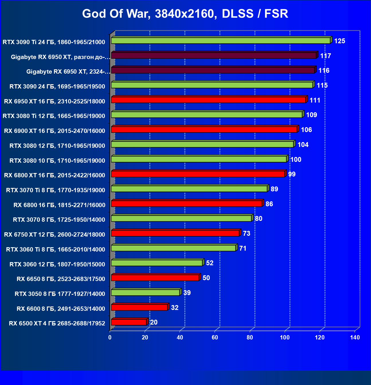 | 14 | Gigabyte RX 6950 XT, 2324—2670/18000 | 71 | 704 | 99 000 |