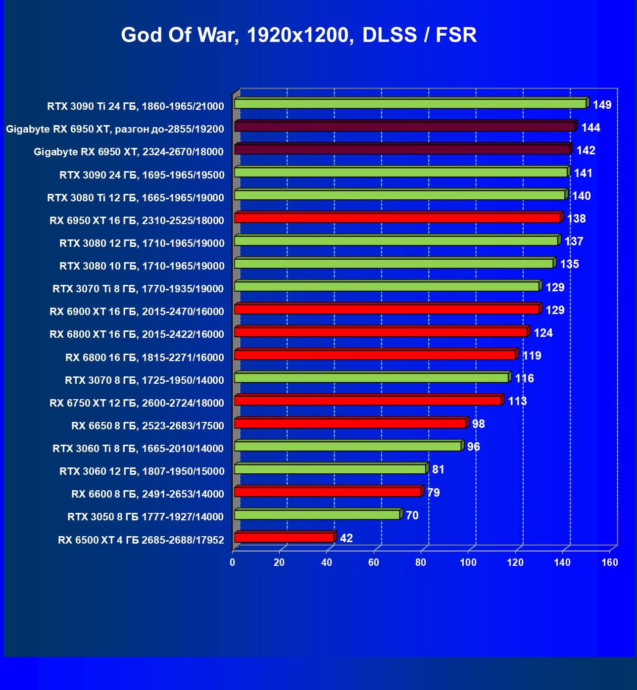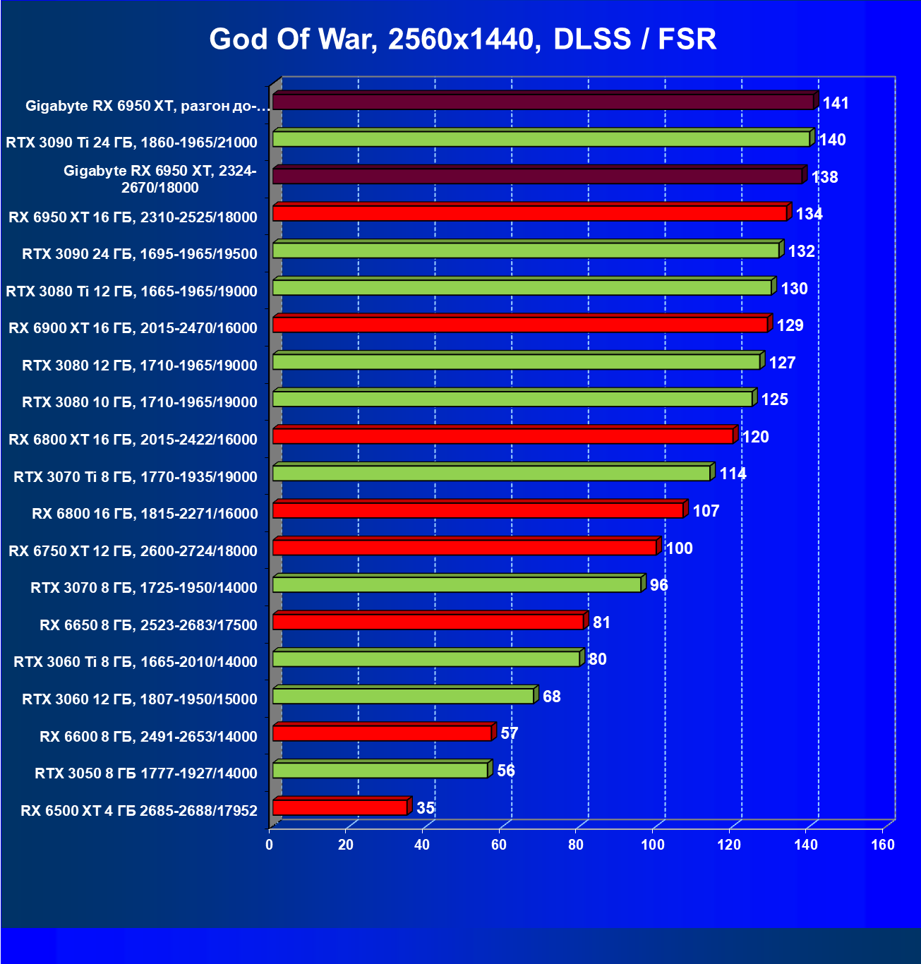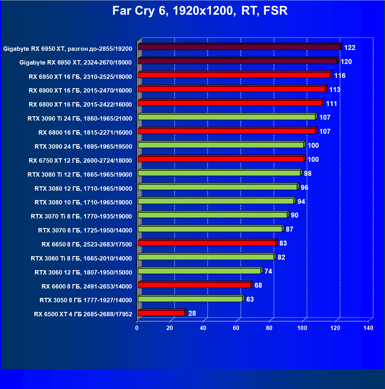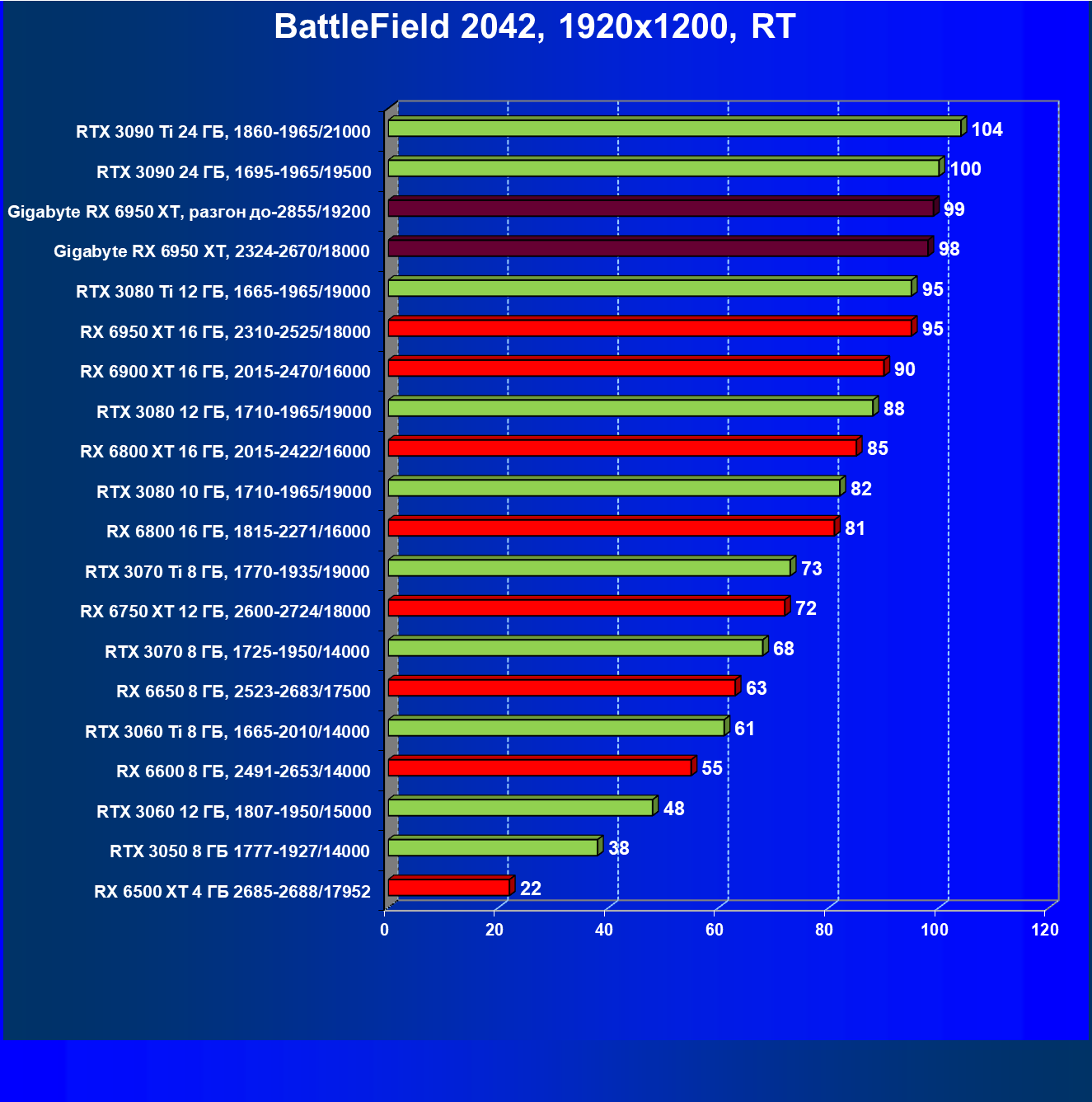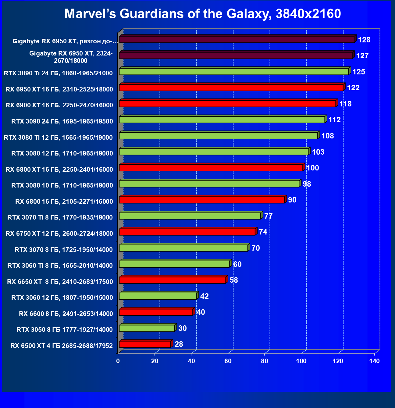 | 14 | Gigabyte RX 6950 XT, 2324—2670/18000 | 71 | 704 | 99 000 |
