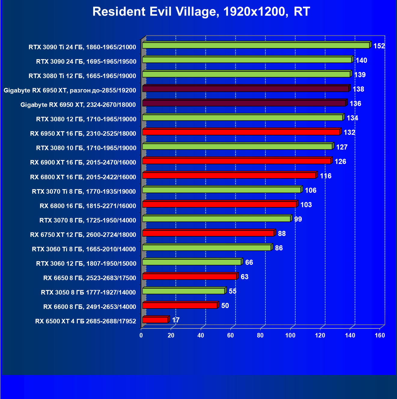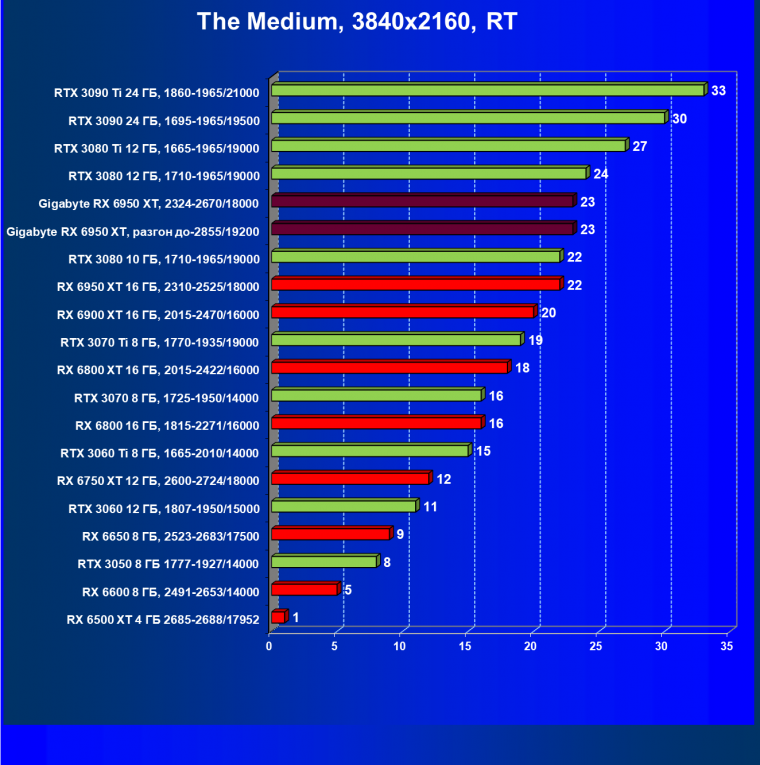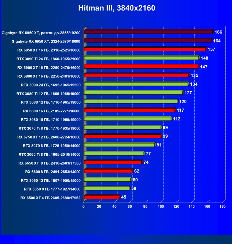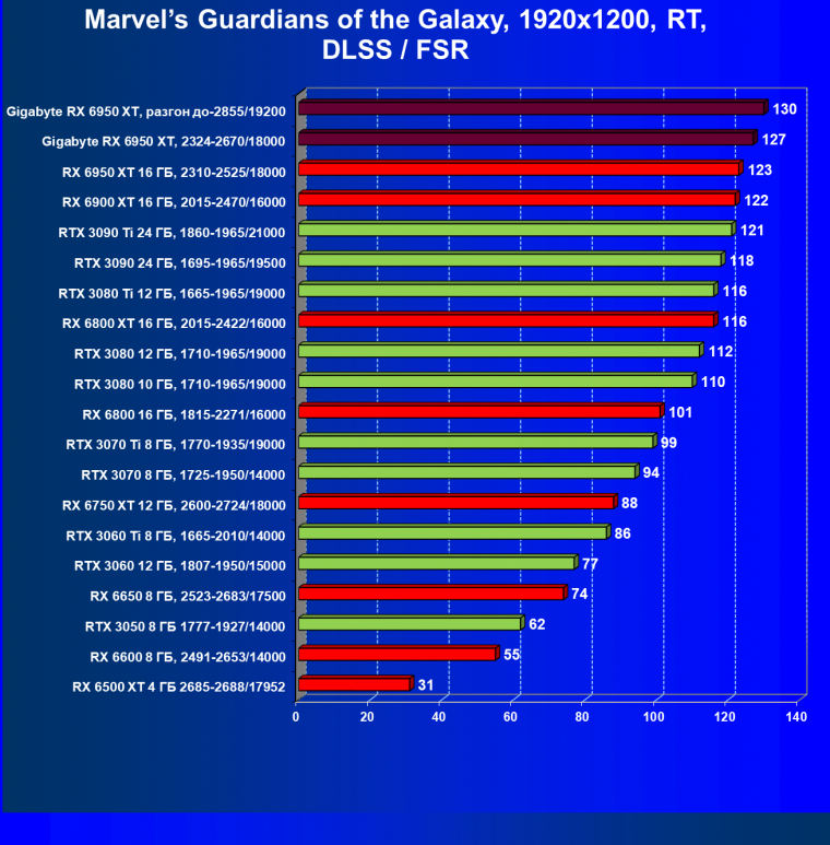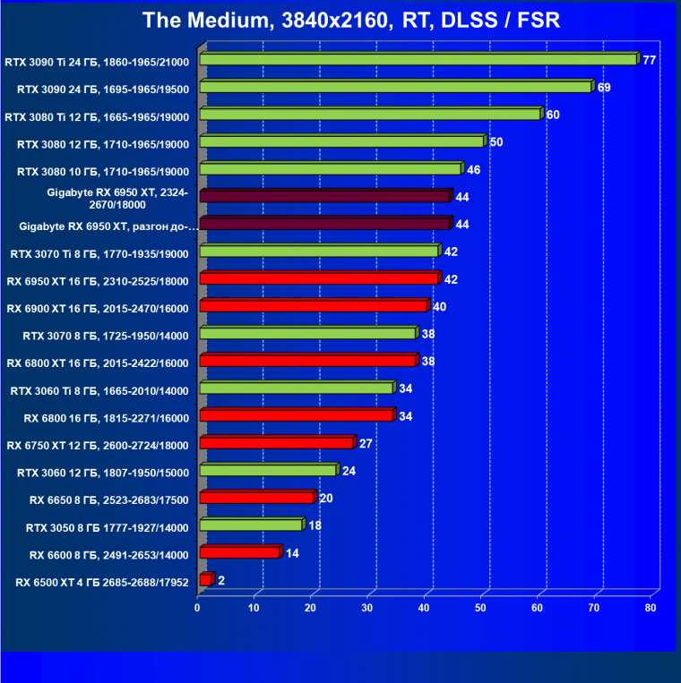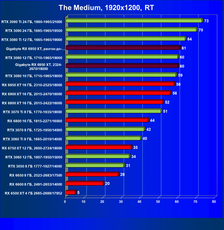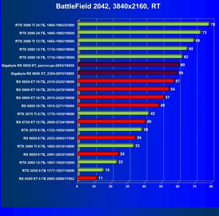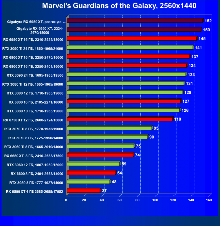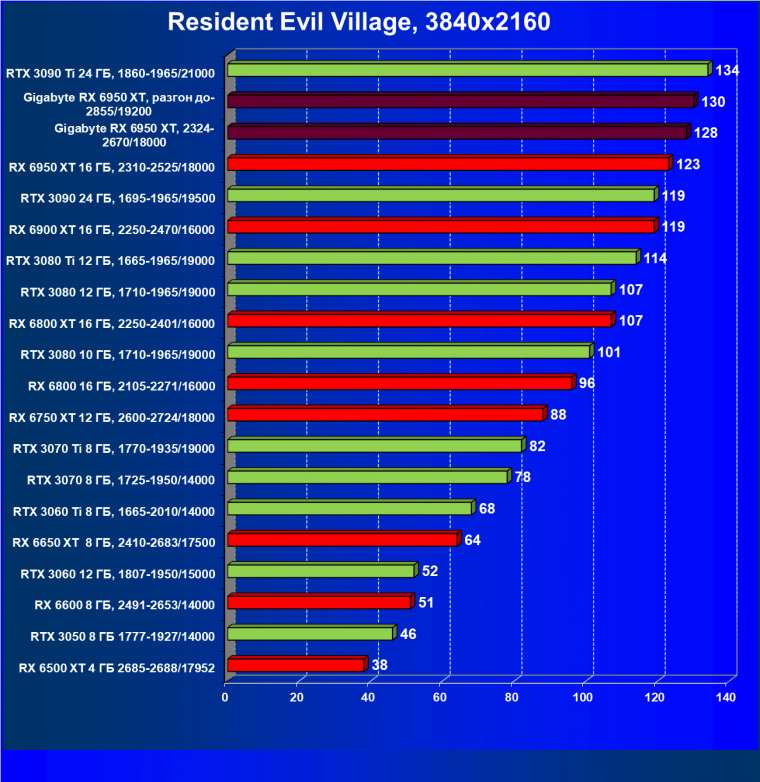 Прекрасно видно, что RX 6950 XT идет практически на уровне RTX 3090 Ti. То есть это действительно конкуренты в классических играх. Карта Gigabyte вышла в лидеры за счет более высоких частот работы.