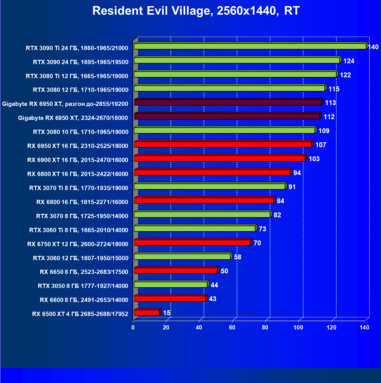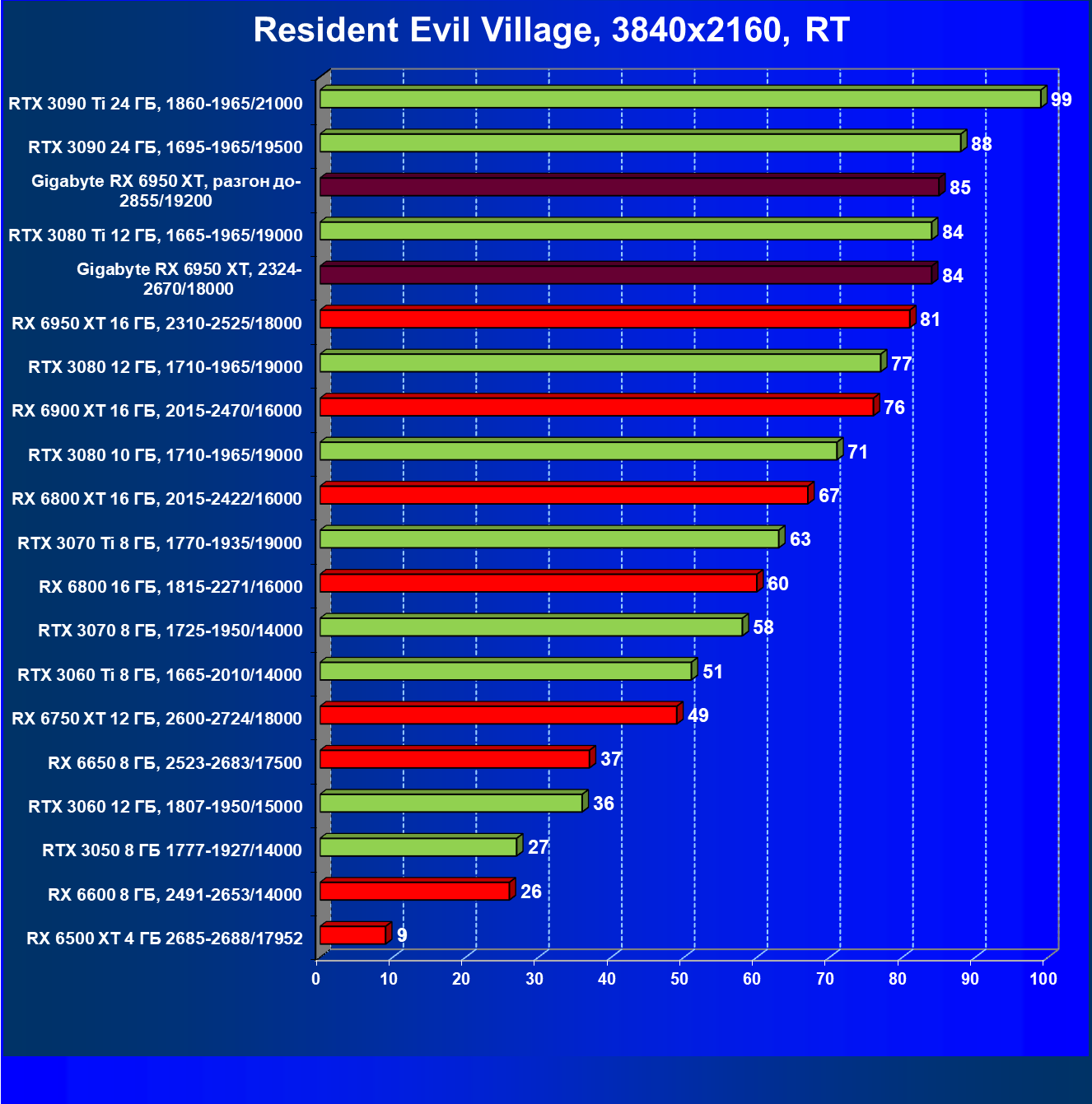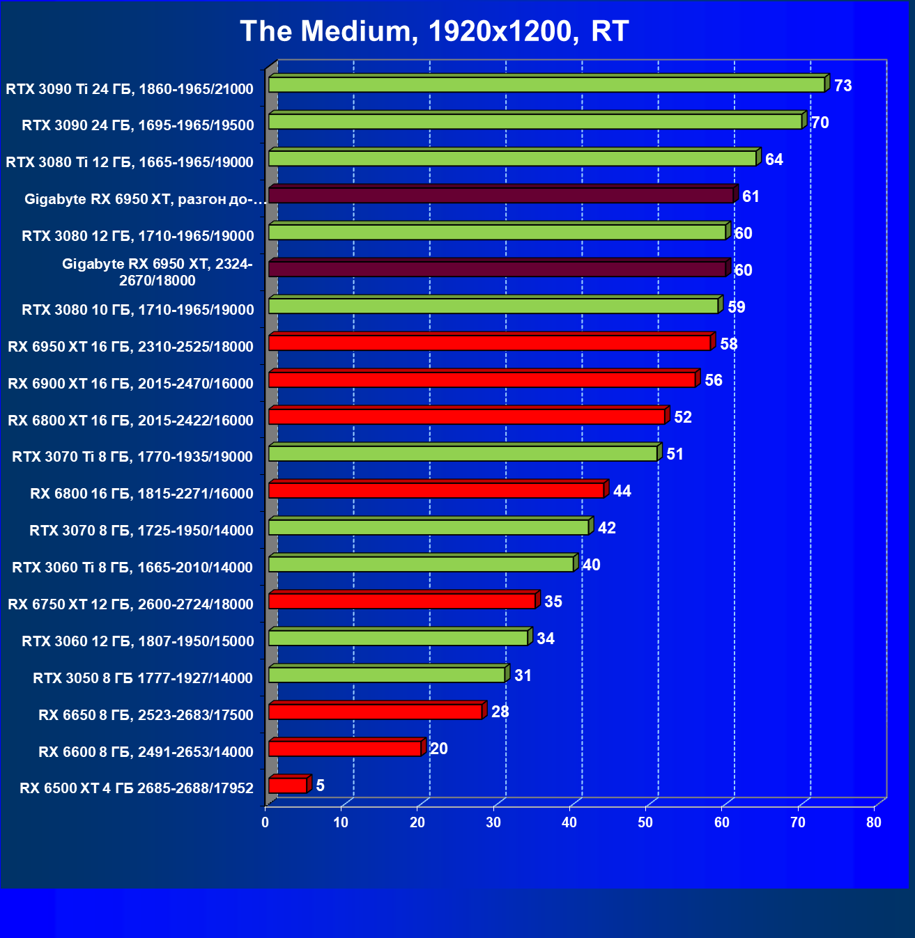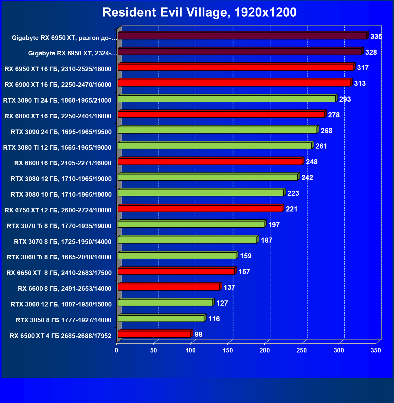 Прекрасно видно, что RX 6950 XT идет практически на уровне RTX 3090 Ti. То есть это действительно конкуренты в классических играх. Карта Gigabyte вышла в лидеры за счет более высоких частот работы.