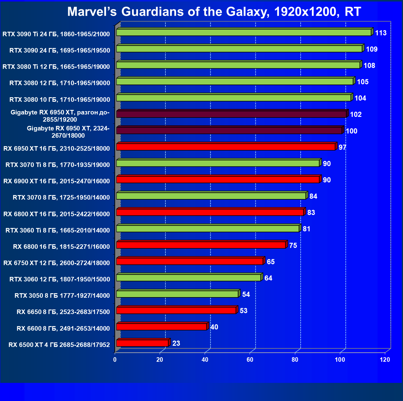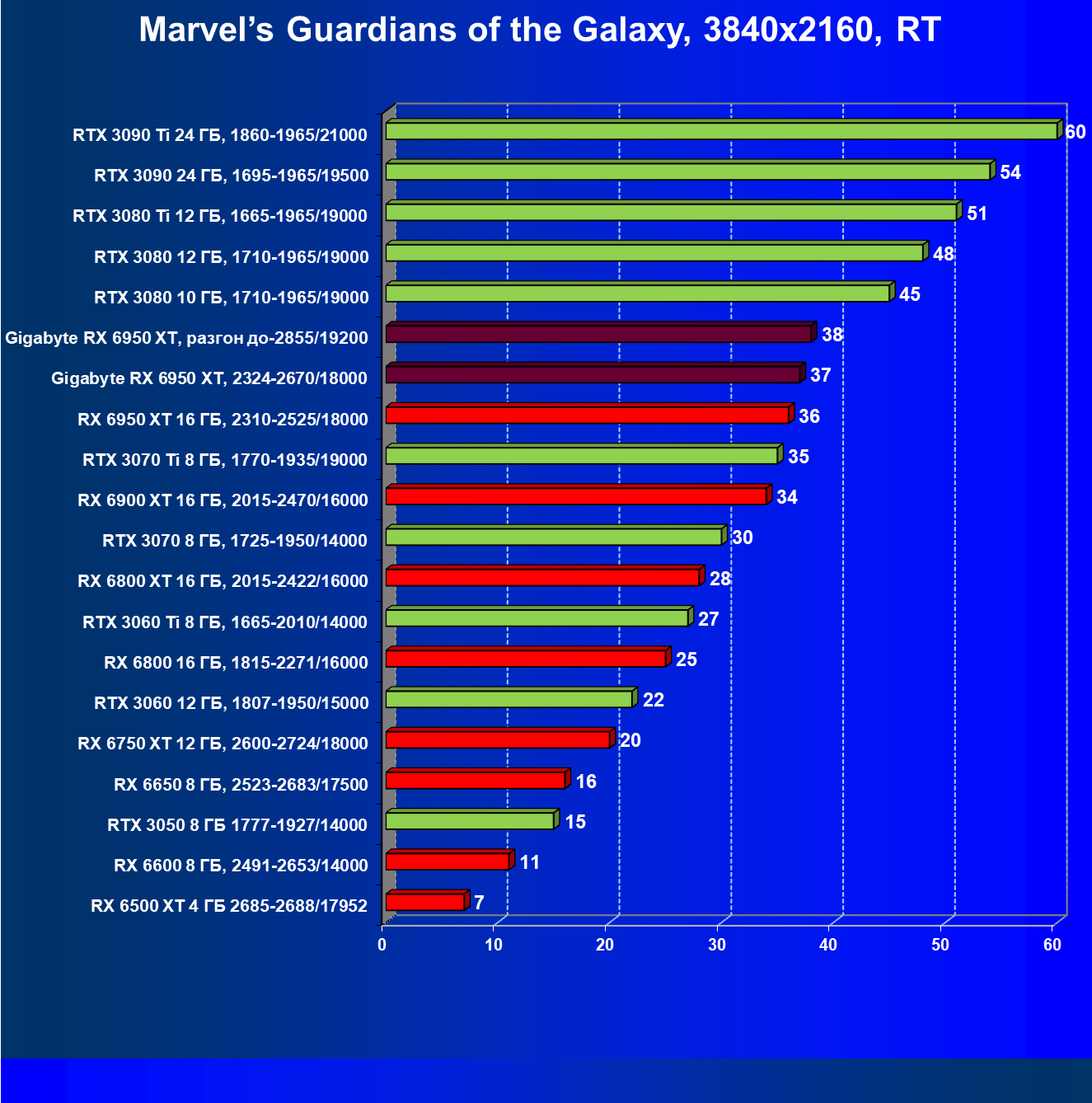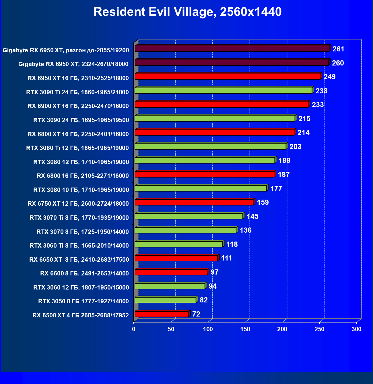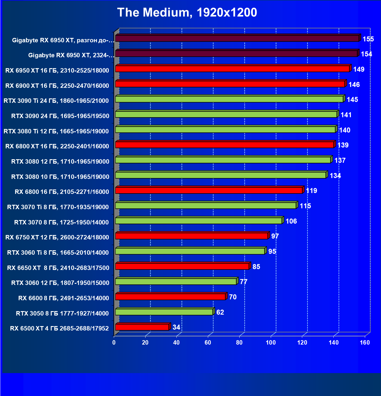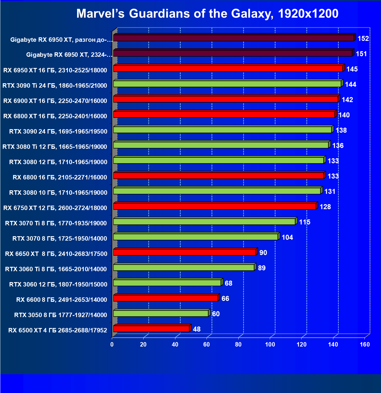 Прекрасно видно, что RX 6950 XT идет практически на уровне RTX 3090 Ti. То есть это действительно конкуренты в классических играх. Карта Gigabyte вышла в лидеры за счет более высоких частот работы.