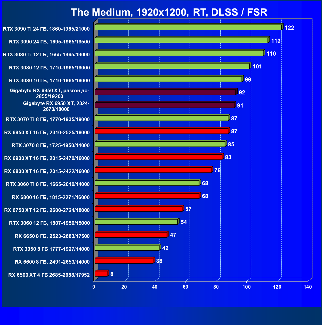 С учетом немного большего снижения в целом производительности у Radeon в играх с RT (+FSR/DLSS), нежели у конкурентов из стана Nvidia, в данном рейтинге одерживает победу RTX 3080 Ti, да и сильно подешевевший RTX 3090 смотрится очень даже привлекательно.