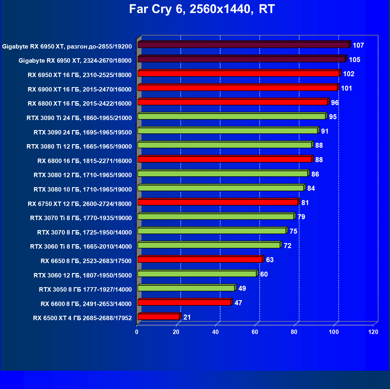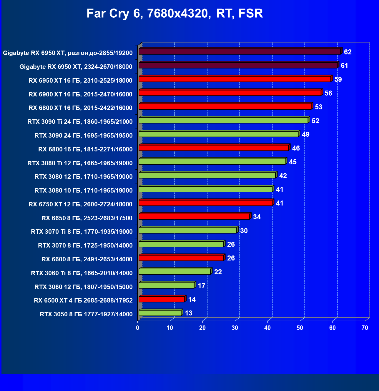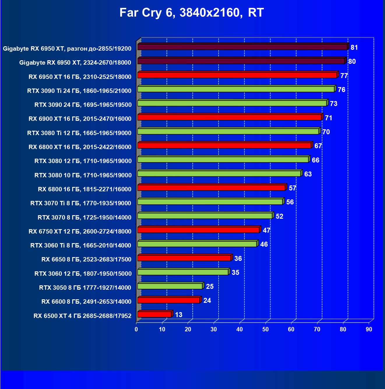 | 13 | RX 6900 XT 16 ГБ, 2250—2470/16000 | 71 | 629 | 88 000 |