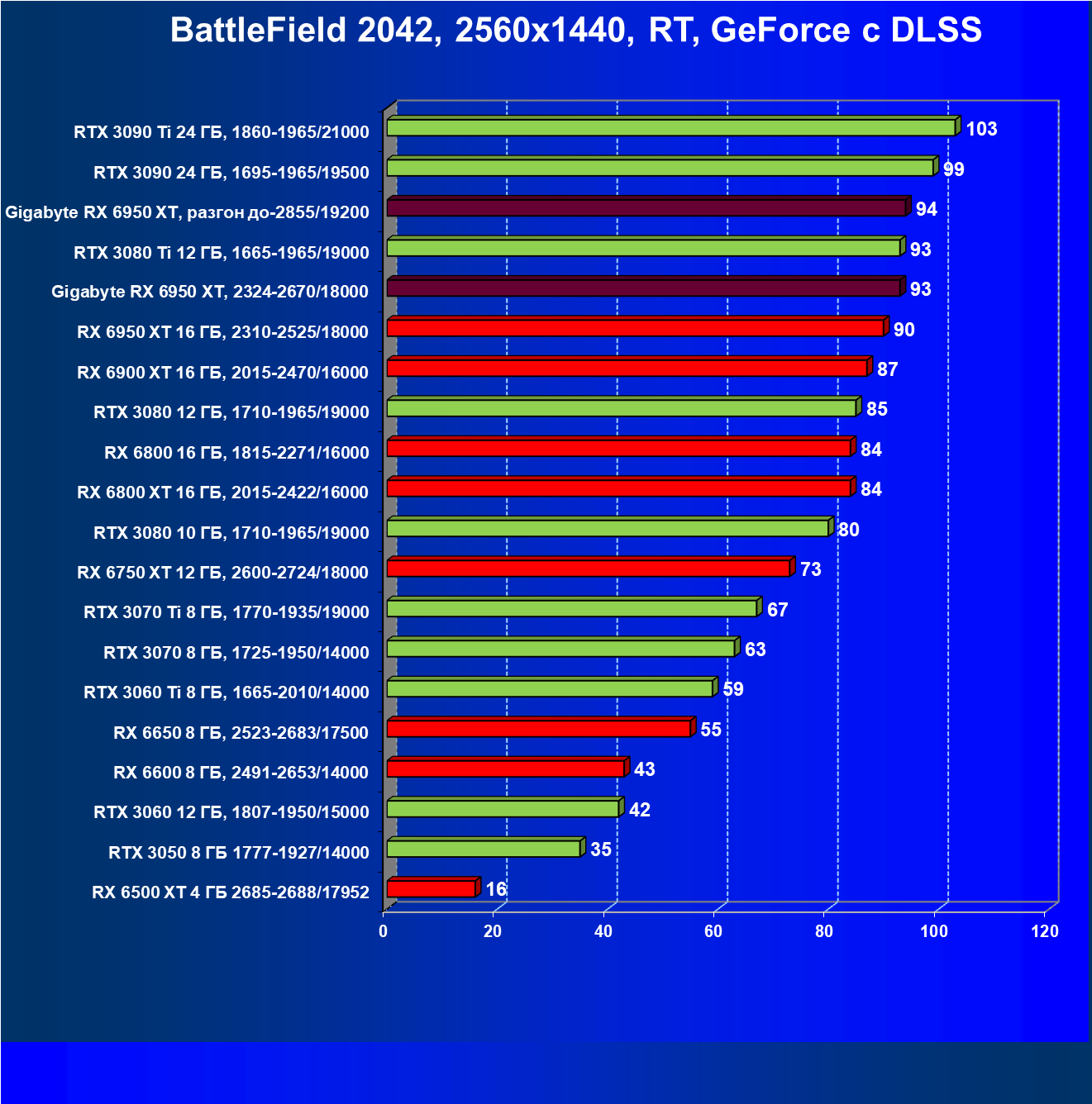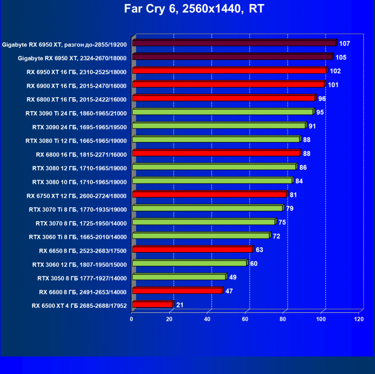 | 13 | RX 6900 XT 16 ГБ, 2250-2470/16000 | 95 | 834 | 88 000 |