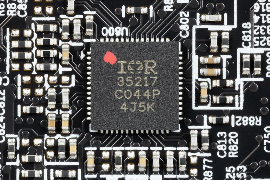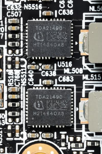 В преобразователе питания, традиционно для всех современных видеокарт, используются транзисторные сборки DrMOS — в данном случае TDA21490 (все того же IR/Infineon).