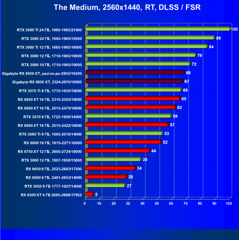 | 05 | Gigabyte RX 6950 XT, 2324—2670/18000 | 674 | 68 | 99 000 |