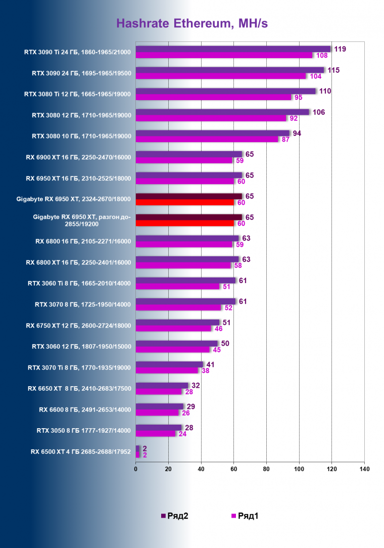 | 02 | Gigabyte RX 6950 XT, 2324—2670/18000 | 463 | 47 | 99 000 |